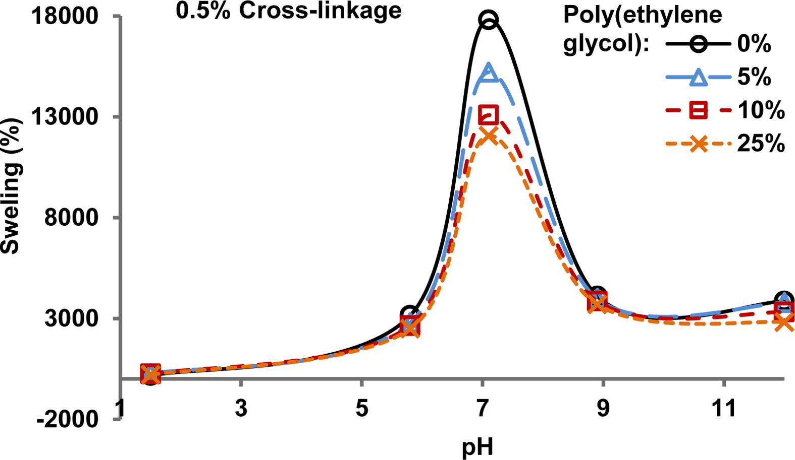 The pH sensitivity of the hydrogels is a desirable characteristic for drug delivery applications.7,27 This is because pH varies in different parts of the body. For example, the pH in the stomach is < 3 which is much lower than the pH of about 7 in the intestines.27 So, the pH stimulus-response can be utilized to deliver the drug loaded on the hydrogel at a desired location in the body.7 The results described above show that the addition of poly(ethylene glycol) in this study decreased the swelling of the hydrogel to some extent. Still, it provided a tool to control the kinetic parameters and adjust the pH stimulus-response of the hydrogel.