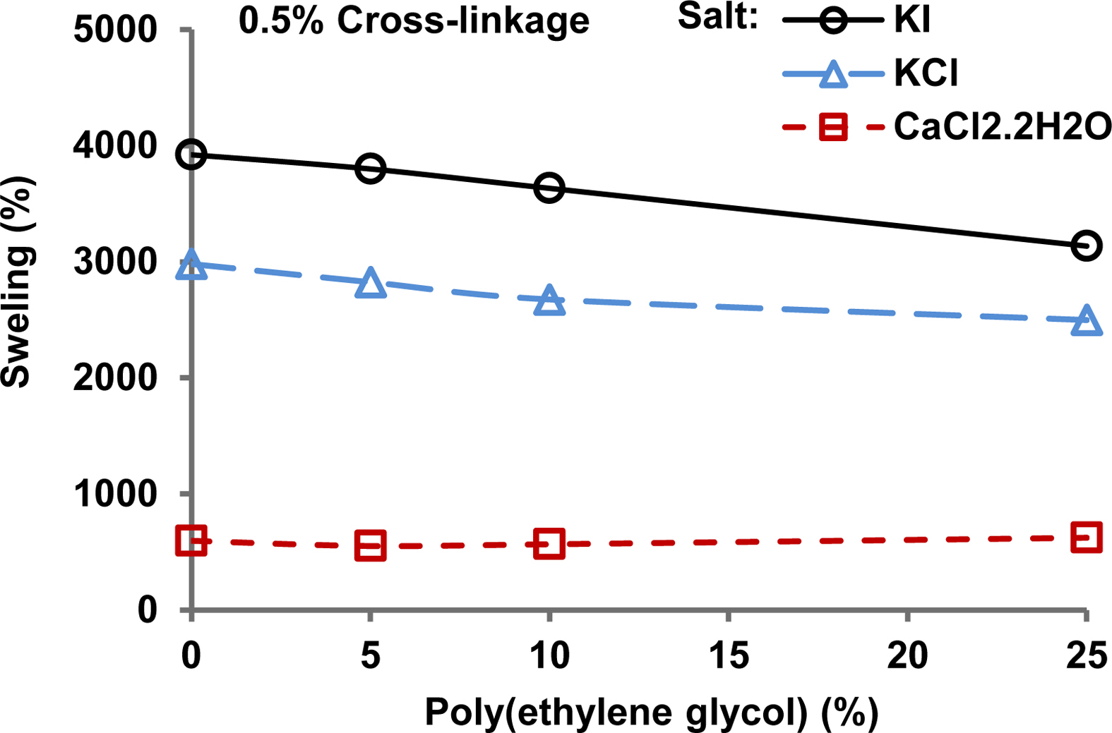The hydrogel showed more swelling in KI than the KCl solution because the iodide ions have less ionic strength due to less charge-to-volume ratio than chloride ions. The ionic strength of divalent ions is more than monovalent ions, and hence hydrogel samples in a 0.9% w/v solution of KCl swell more than in a solution of CaCl2·2H2O.