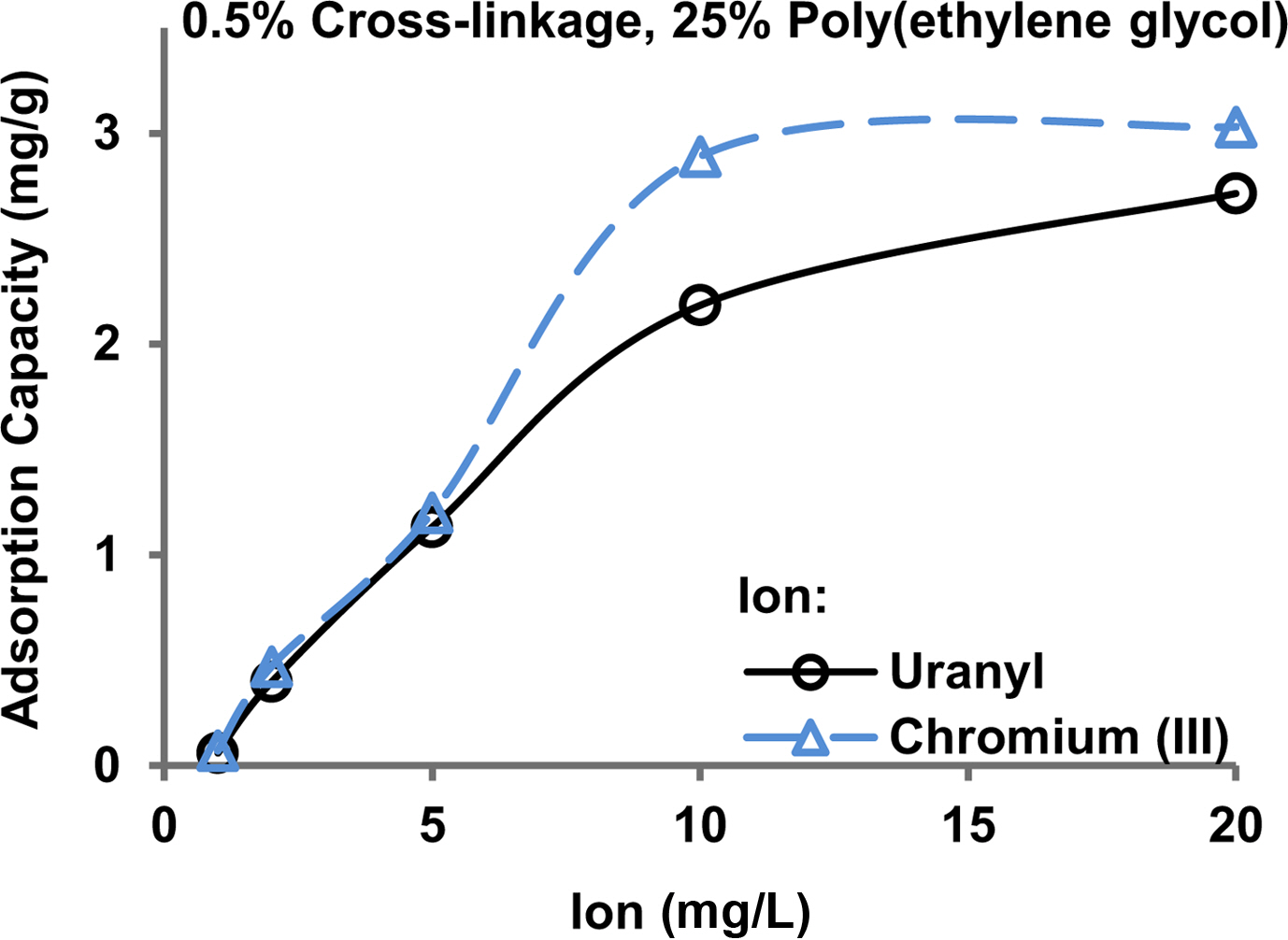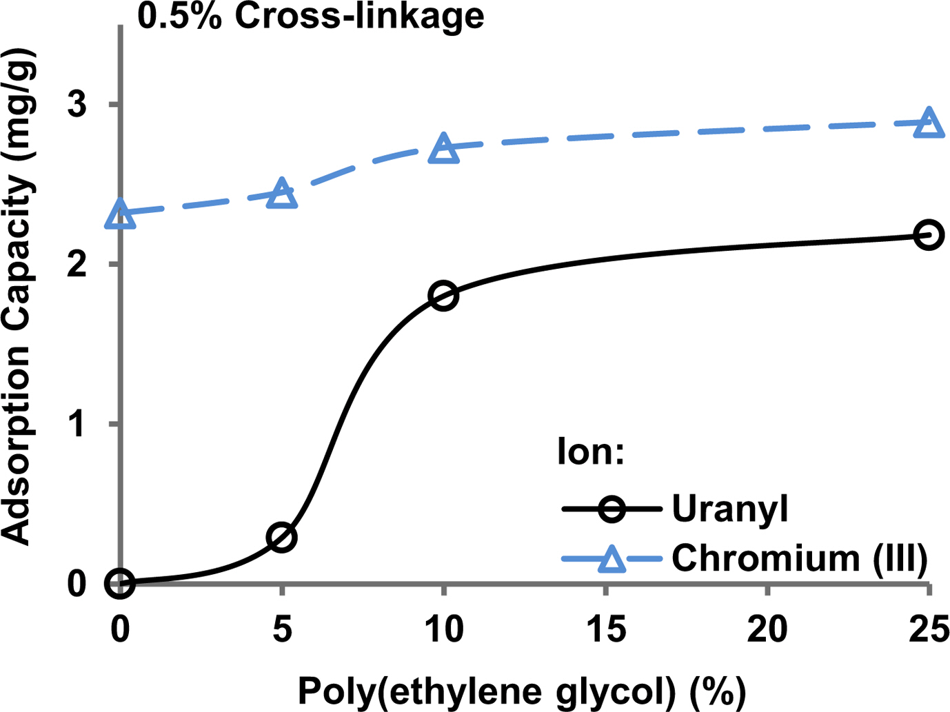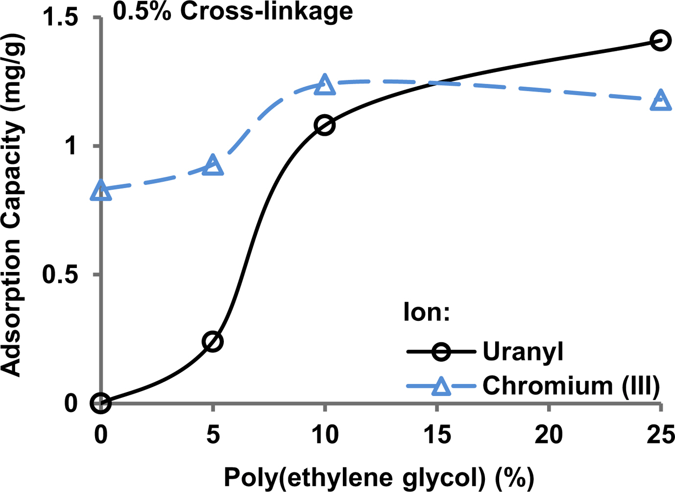 In the following experiments, adsorption of uranyl and chromium(III) ions from a 1-to-1 mixture of chromium(III) and uranyl ions was studied. Poly(ethylene glycol) content in the hydrogel was gradually varied from 0 to 25%. Results in Figure 8 shows that chromium(III) was selectively adsorbed in the absence of poly(ethylene glycol). Both uranyl and chromium(III) ions were adsorbed in the presence of poly(ethylene glycol). The adsorption capacity for both the ions increased with an increase in the poly(ethylene glycol) content. The selectivity remained higher for chromium(III) compared to uranyl in all cases studied for up to 10% poly(ethylene glycol) and changed in favor of uranyl ions for 25% poly(ethylene glycol) in these experiments. These results show that the addition of poly(ethylene glycol) provided another tool to tailor the characteristics of the hydrogel, i.e., the chelating ability that allows adsorption and removal of more toxic heavy metal ions, like uranyl ions.
