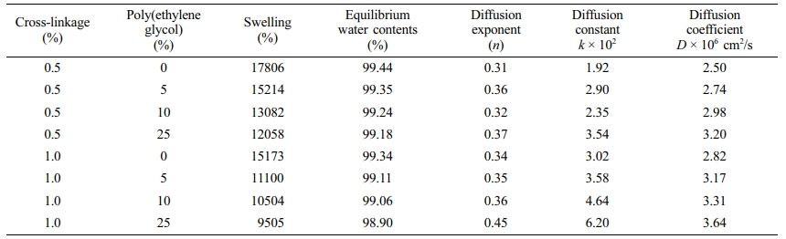 Table 1 shows the swelling percentage, equilibrium water contents percentage, diffusion exponent (n), diffusion constant (k), and diffusion coefficient (D) of the synthesized hydrogels for 0.5% and 1.0% cross-linkage in the monomers. The swelling percentage shows the total water uptake by the hydrogels, whereas the equilibrium water content percentage is the ratio of the water to the polymeric hydrogels in the matrix. The results show that the swelling percentage is significantly higher for the case of 0.5% cross-linkage compared to the 1.0% cross-linkage for the same poly(ethylene glycol) content in all the cases compared. The same trend is observed in the case of equilibrium water content percentage though the difference in the values was smaller. The increase in the cross-links makes the copolymer chains less flexible. It reduces the pores size i.e. the distances between cross-links and chains in the copolymer matrix resulting in lesser swelling in water.