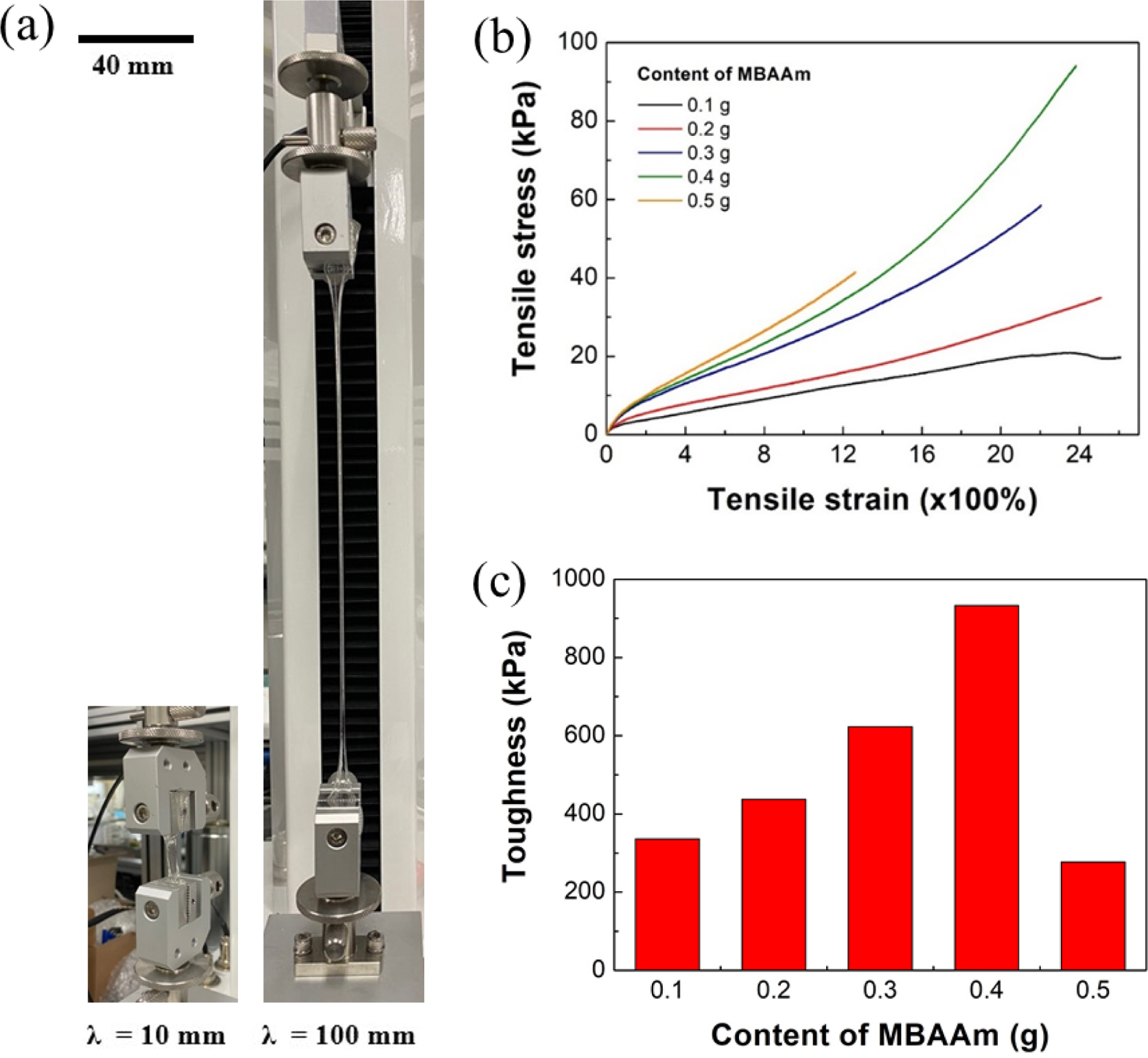 Tensile test of SA/PAM hydrogel: (a) image of measuring tensile stress of hydrogel (λ: distance between the two clamps); (b) tensile stress-strain curve of hydrogels according to the content of crosslinker, MBAAm; (c) toughness of hydrogels according to the content of MBAAm.