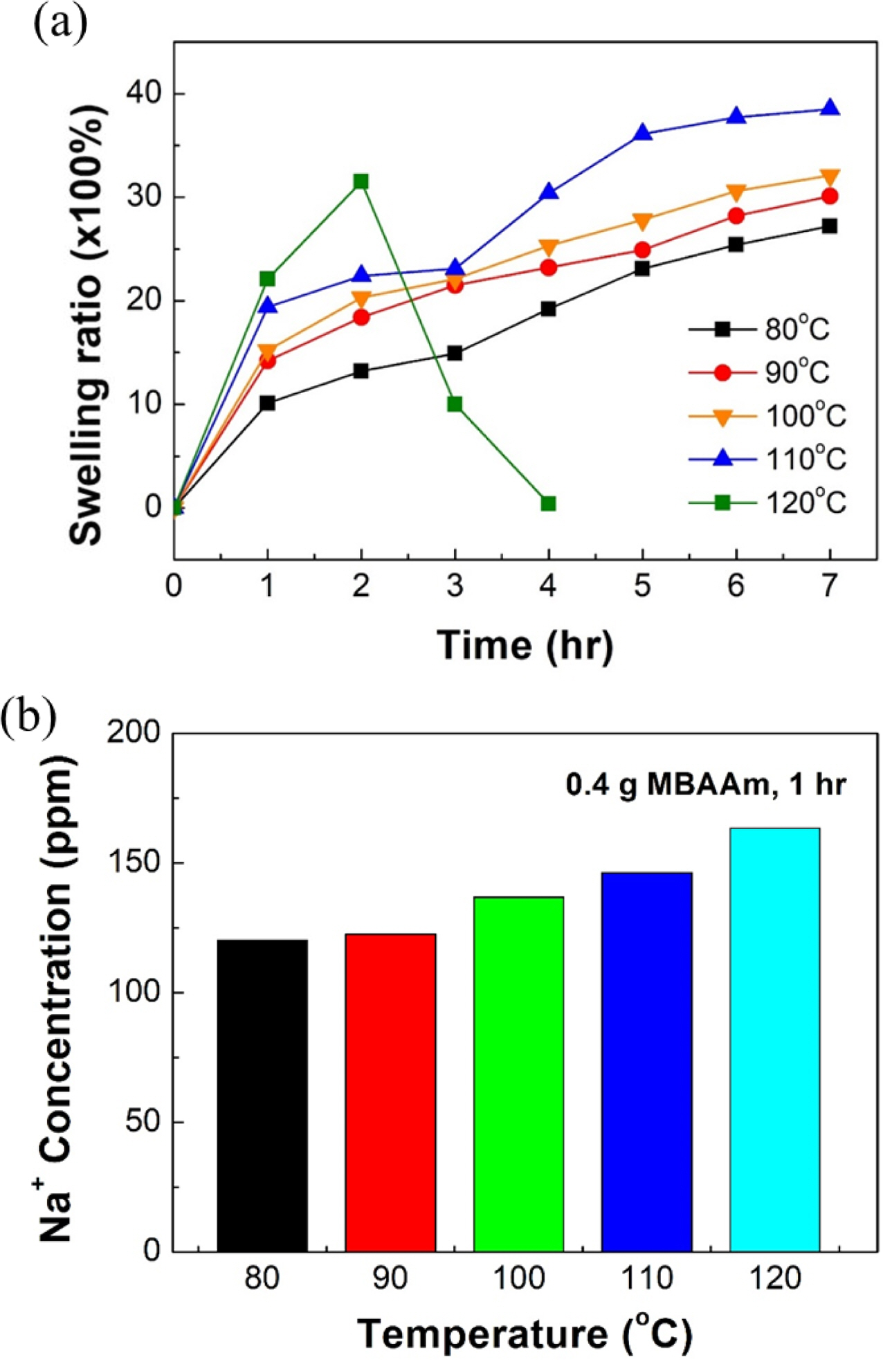 Swelling tend ency of SA/PAM hyd rogel with 0.4 g MBAAm according to temperature of the water in which hydrogels were dipped: (a) swelling ratio of SA/PAM hydrogel over swelling time; (b) Na+ concentrations of water in which hydrogels were dipped