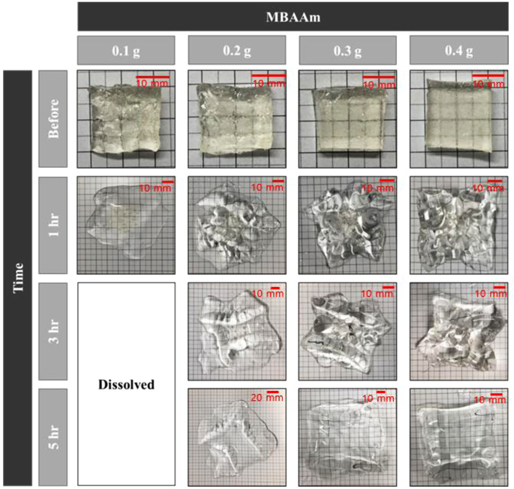Dissolution Rate Analysis According to Water Temperature and MBAAm Content. To confirm the effect of MBAAm content on dissolution rate, hydrogels with various MBAAm contents of 0.1, 0.2, 0.3, 0.4, and 0.5 g were analyzed at 100 °C. First, 400 mL of distilled water was heated to boiling. An autoclave container capable of maintaining a constant pressure and temperature was filled with boiling water. Then a 20 mm×20 mm×10 mm hydrogel specimen was placed in the autoclave container. Its weight, size, and shape were analyzed every hour to confirm swelling and dissolution. For accurate analysis, the size and weight were measured after removing water on the surface. The swelling ratio was calculated using the following eq.: