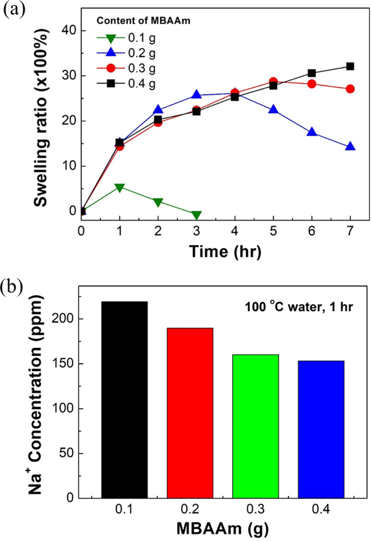Swelling tendency of SA/PAM hydrogel according to MBAAm content in 100 ℃ water: (a) swelling ratio of SA/PAM hydrogel over swelling time; (b) Na+ concentrations of water in which hydrogels were dipped.