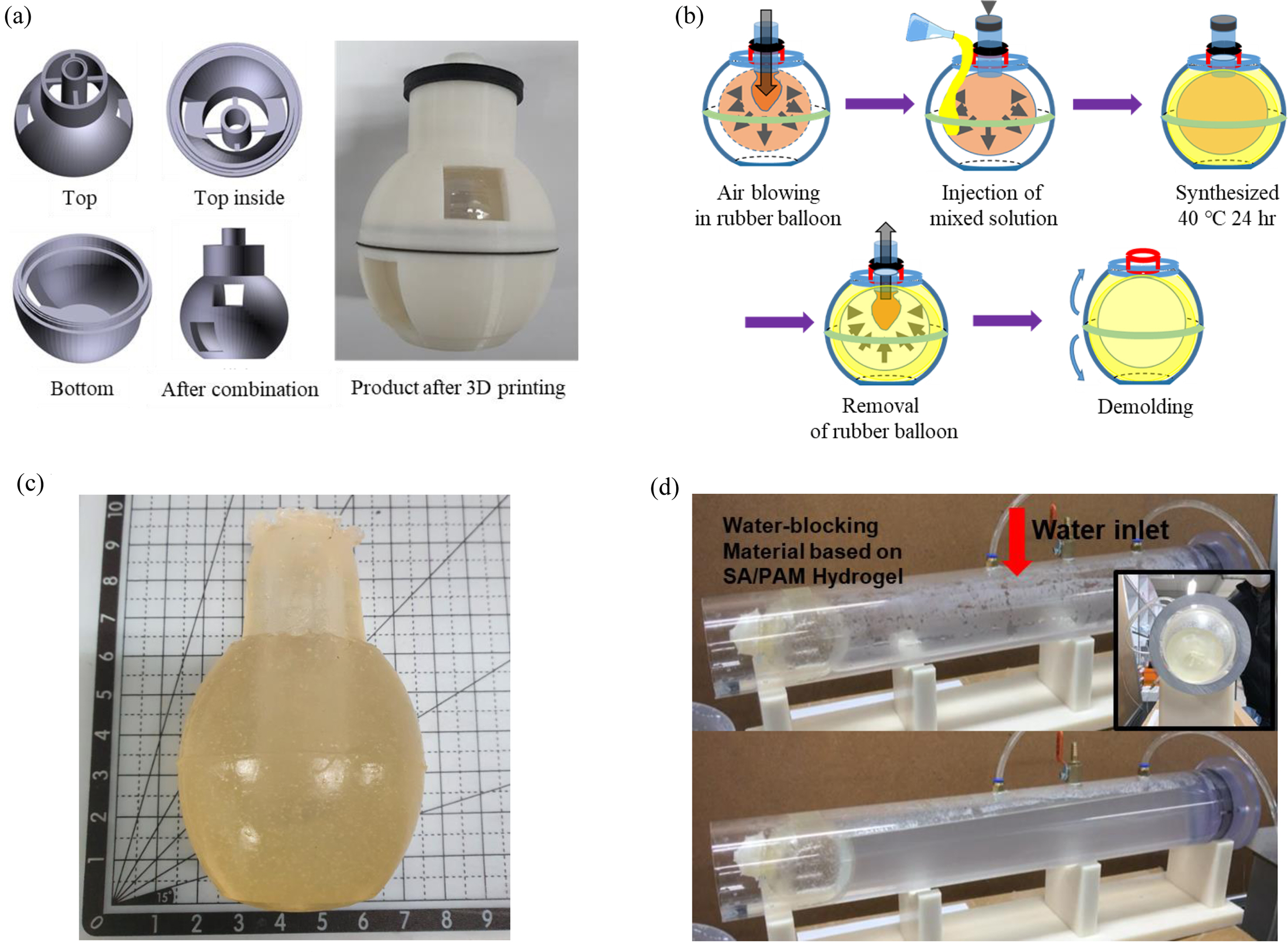 Water-blocking test of SA/PAM hydrogel in the pipe: (a) balloon-type mold made of ABS was fabricated by 3D printing; (b) manufacturing process of the balloon-type water-blocking material using the 3D printed mold; (c) water-blocking balloon made of SA/PAM hydrogel; (d) water-blocking test in a simulated pipe. Water was allowed to circulate inside the pipe to keep the water temperature co
