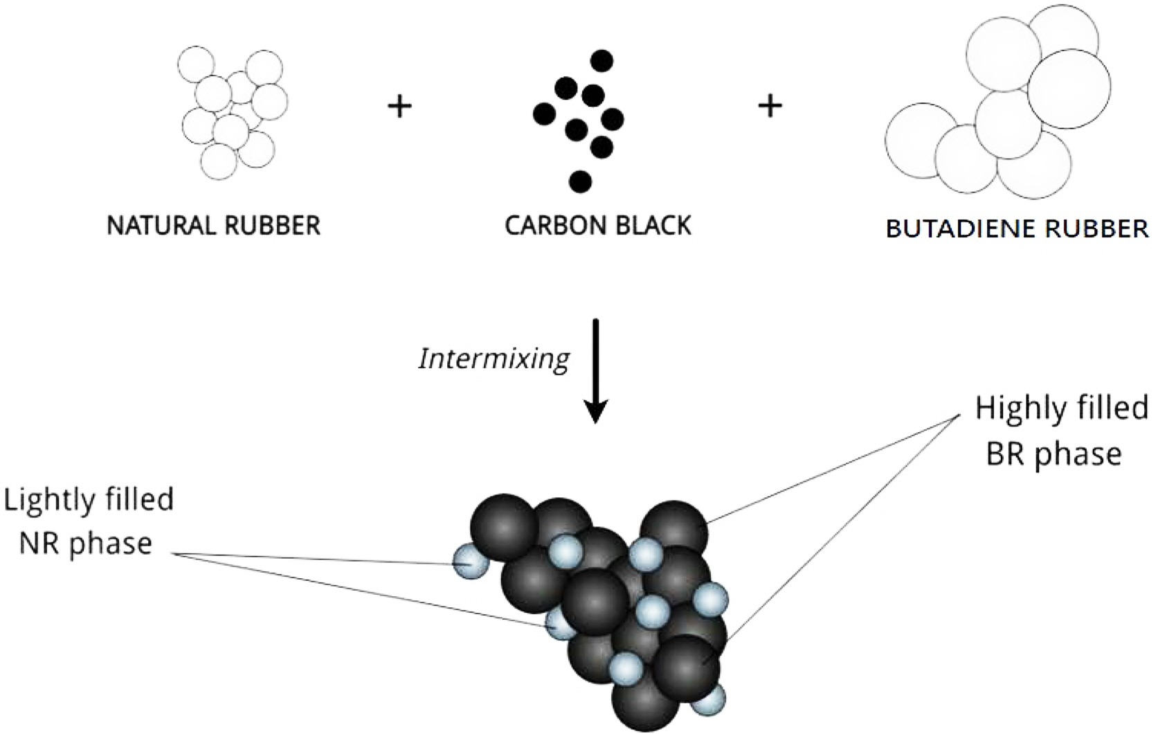 The blending of natural rubber (NR) with butadiene rubber (BR) is a common practice to achieve the desired profile characteristics for tire tread. In order to achieve the desired mechanical and physical properties, the blends is mixed with reinforcing fillers like carbon black (CB) or silica. The process of incorporation of the filler and the distribution of the filler plays a crucial role in determining the final properties of the blend.1-4 There are many reviews addressing the filler distribution issues in the literature.5-7