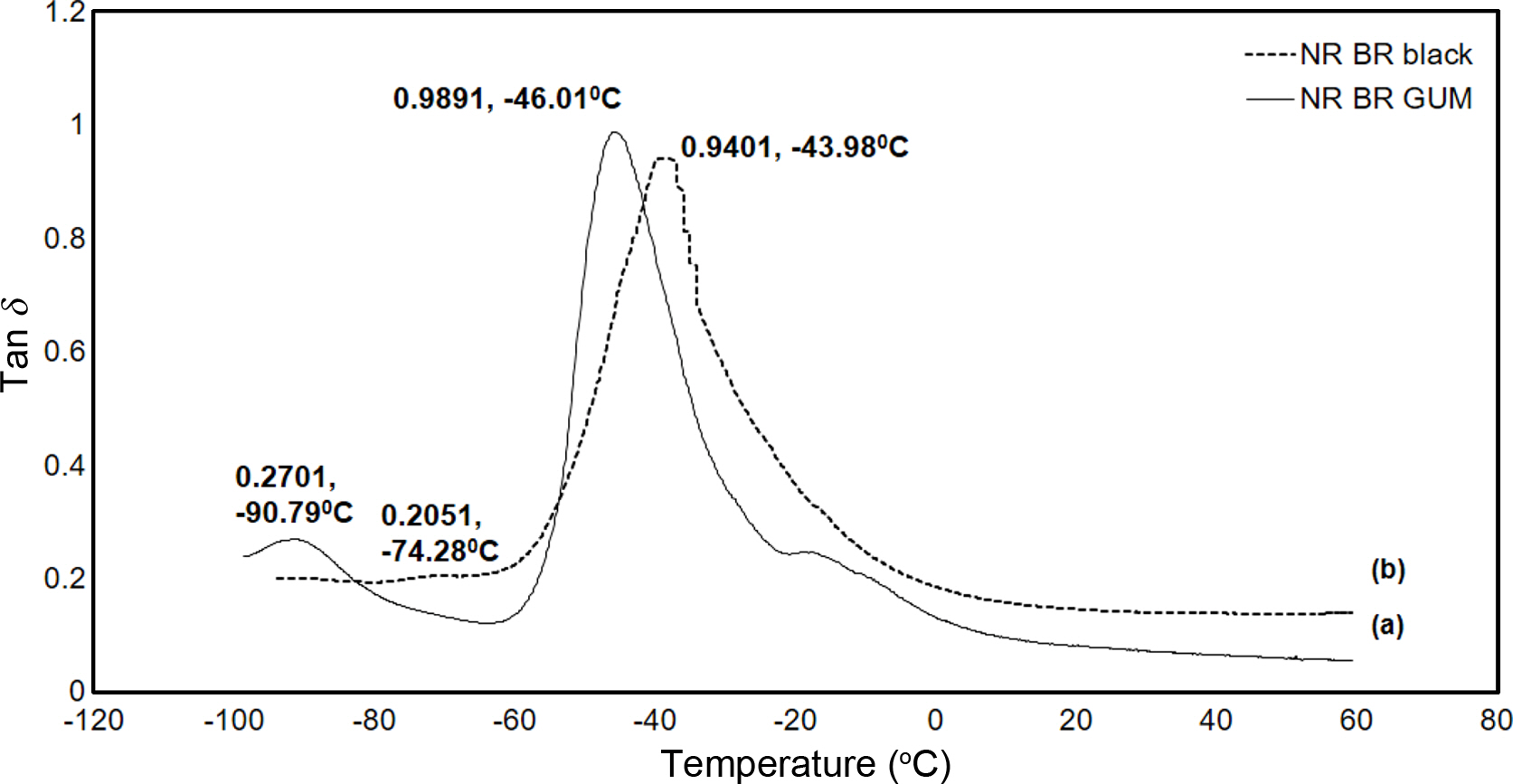 From Figure 2, it was found that the carbon black contribution in NR/BR blend is not uniform as black showed preferential migration towards the BR phase. High values of tan δ indicate that the material has high, non-elastic strain regions whereas low tan δ indicates highly elastic components. The effect of N330 loading on the loss tangent of filled and unfilled blends is shown in Figure 2. It can be seen that the peak of tan δ of filled NR/BR blend has shifted towards higher temperature compared to NR/BR gum. This is because on addition of N330, the restriction on the mobility of polymer chains has been increased. The distribution of filler can be explained on the basis of Tg since the maximum value of tan δ corresponds to the Tg. On addition of N330, there is shift on Tg value towards higher temperatures. The values are tabulated in Table 3.