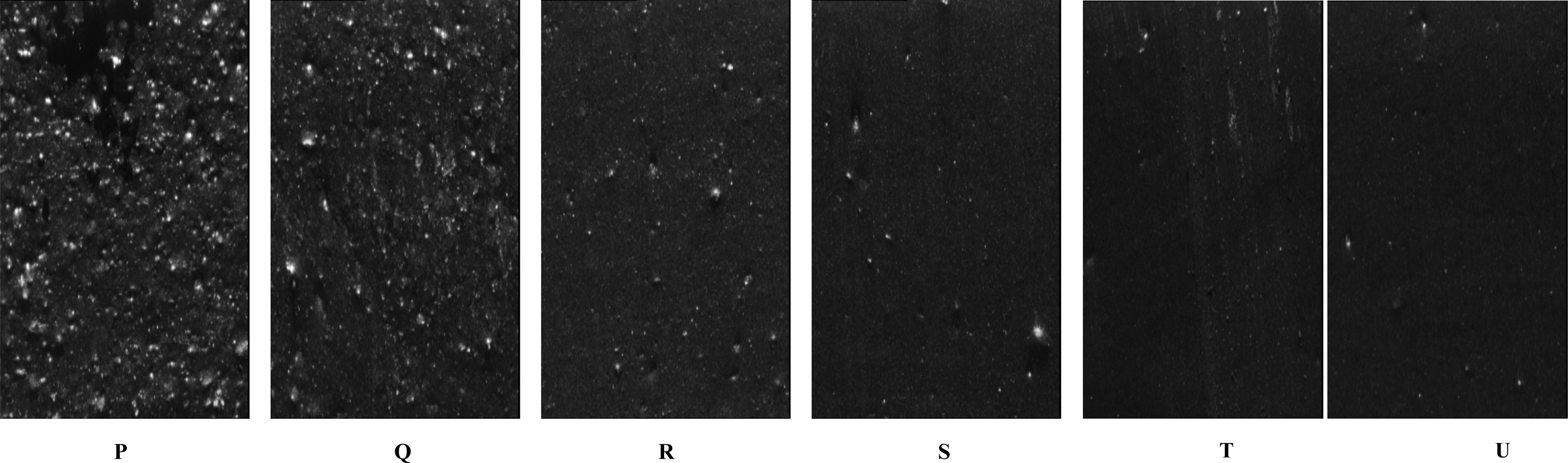 Carbon Black Dispergrader. The dispersion of carbon black in the blend was analysed using a dispergrader. The measure of the dispersion and amount of black is generally expressed by two parameters say X and Y. X-value is the measure of the dispersion of carbon black filler in the polymer matrix. The Y-value only takes into account the bigger agglomerates.35 It was found that there is a homogenous distribution of carbon black in the blend and the homogeneity increased with the BR content (Table 5). The Figure 3 (P to U) shows the dispersion details of the freshly cut surface of the samples. Lower the white areas in the field, higher will be the quality of the dispersion. The trend was found to be decreasing with the increased BR content.