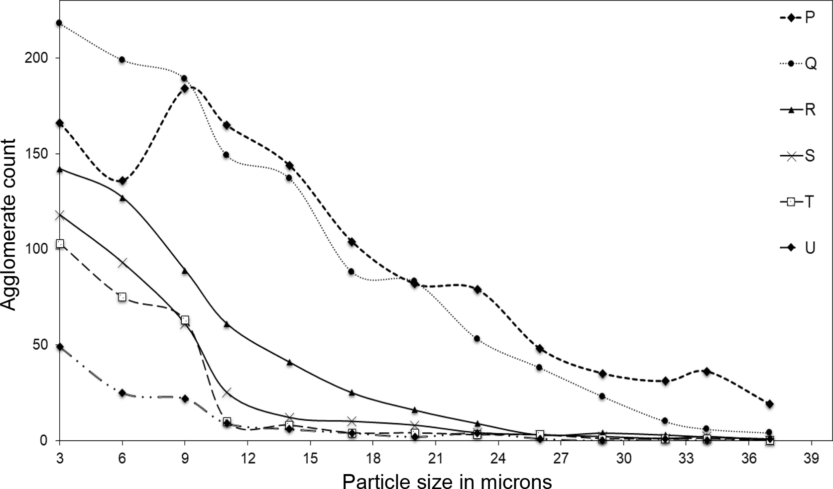 Dispergrader have analyzed the sample area of 2.1 mm×1.6 mm=3.36×106 μm2. The generated histograms have provided a distribution of average particle frequency for 3 scanning processes (Figure 4).