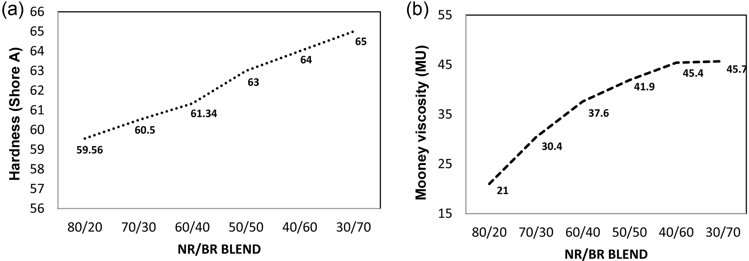 Hardness and Mooney Viscosity: Hardness was measured using Durometer Hardness Tester (Shore A) and Mooney viscosity using Mooney Viscometer MV 2000.
