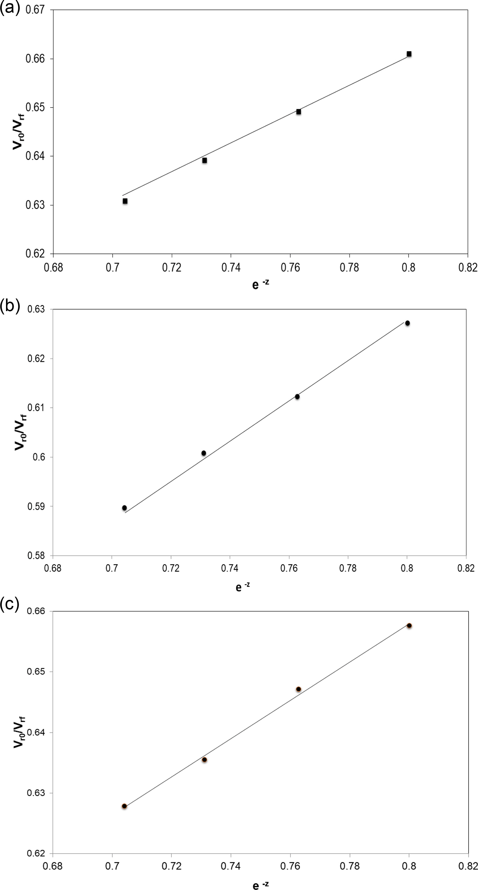 Figure 6 Plot of Vr0/Vrf vs. e-z for (a) NR/N330; (b) BR/N330; (c) NR/BR/N330. |