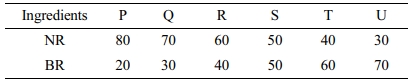 Preparation of Compounds. The compounds (Table 1) were prepared in two stages- initially a master batch consisting of NR, BR and other additives except curing systems were mixed in an intermix (Francis Shaw, KO intermix MK3) of capacity of 1 litre for 6 min. The temperature was maintained at 50 oC with a rotor speed of 50 rpm. Then the mixes were prepared in a laboratory size two-roll mixing mill (150×325 mm) at a friction ratio of 1:1.25 according to ASTM 3182-07. The temperature of the roll was maintained at 60 oC. The samples were then cured at a temperature of 150 oC using a Monsanto Rheometer (Rheometer MDR 2000).