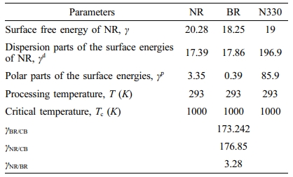 Localization of N330 in the Blend. Thermodynamic Factor: A theoretical evaluation was performed to find out the thermodynamically favored localization of N330 carbon black in the blend. It has been reported that the localization of the filler in a heterogeneous blend is guided by the minimization of interfacial energy.22,23 There are two main equations to find the interfacial energies in a polymer blend. They are harmonic-mean equation (Wu’s equation) and geometric-mean equation (Owens-Wendt-Rabel-Kaelble equation). Wu’s eq. (1) is used for non-polar/non polar blend system whereas OWRK eq. (2) is for polar/non polar system