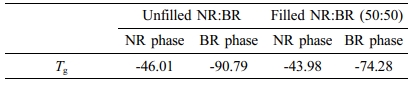 where “g” and “f ” represents the gum and filled systems respectively. The tan δmax is obtained from DMA. The calculated values (RNR=0.0495, RBR=0.2406) have shown that the degree of reduction in RBR is high compared to RNR. The greater reduction of tan δmax corresponds to the higher polymer-filler interaction as a result of preferential migration.