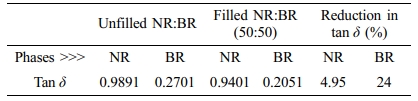 The preferential migration of N330 in BR phase can be understood from the lower tan δ peak values (0.2701 to 0.2051)31 and also due to the shifting of Tg to more positive values (-90.79 to -74.28 oC). It is to be noted that in filled NR/BR blend, the reduction in tan δ peak of NR phase is 4.95 whereas it is 24% in the BR phase compared to unfilled blend (Table 4).32