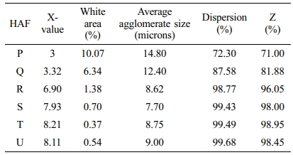 Apart from the X- and Y-values, the Z-values can also be considered for summarizing the filler dispersion. It is the measure of macro-dispersion. The advantage of using Z-value is that it does not rely upon the reference scales. As it is calculated directly from the size distribution histogram, the errors caused by the dispergrader in selecting the reference scales can be avoided and more reliable result can be made. From the studies (Table 5), it was found that the mixes with higher content of BR have higher Z values which indicate good dispersion and affinity.