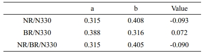 Vr0 and Vrf are the volume fraction of the swollen polymer in a fully swollen unfilled and filled sample respectively, z is the weight fraction of N 330 used (45, 50, 55, 60 phr). A plot of Vr0/Vrf vs. e-z should give a straight line. “a” and “b” represents the slope and intercept which is obtained from the straight line graph (Figure 6). The reinforcing ability and solvent resistance can be assessed using the difference between these two factors. The values obtained from Cunneen-Russel plot is given in Table 6. A simultaneous increase in the “a” value and decrease in the “b” value indicates the extent of interaction with the filler. If the difference between the two values is higher, the interaction of polymer with the filler will be higher. From the table, it is understood that BR/N330 have higher value compared to other two.39
