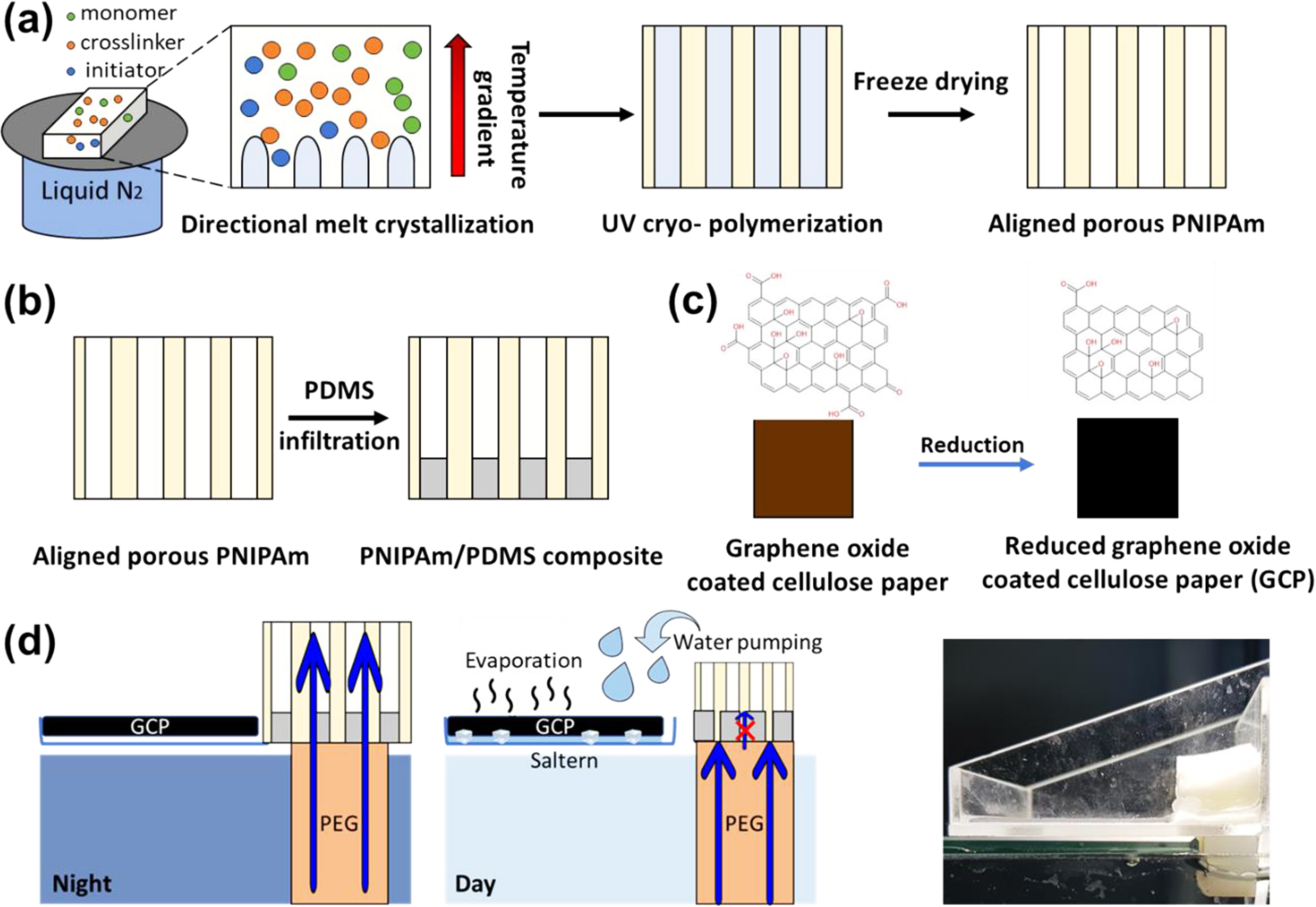 Figure 1 (a) Preparation of aligned porous PNIPAm hydrogels by directional melt crystallization (DMC); (b) preparation of PNIPAm/PDMS composite; (c) preparation of reduced graphene oxide coated cellulose paper (GCP); (d) schematic diagram and photo image of crystallizer based on thermosensitive hydrogels. The blue arrows indicate water flow. |
