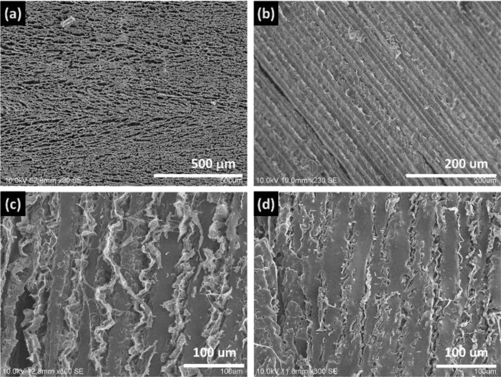 Figure 2 SEM images of (a) top; (b) cross-section of aligned porous PNIPAm; SEM images of cross-section of PNIPAm/PDMS composite after equilibration in (c) 4 oC; (d) 40 oC water. |