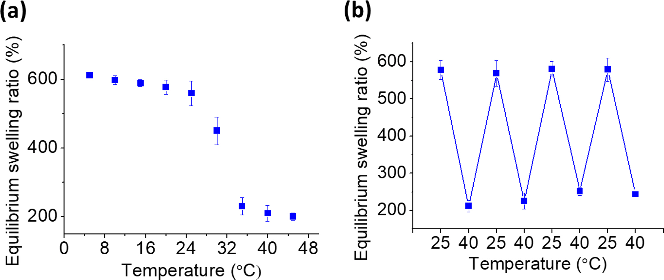 Figure 3 Equilibrium swelling ratio of (a) PNIPAm/PDMS composite; (b) PNIPAm/PDMS composite at cyclic temperature variance of 25 and 40 oC. |