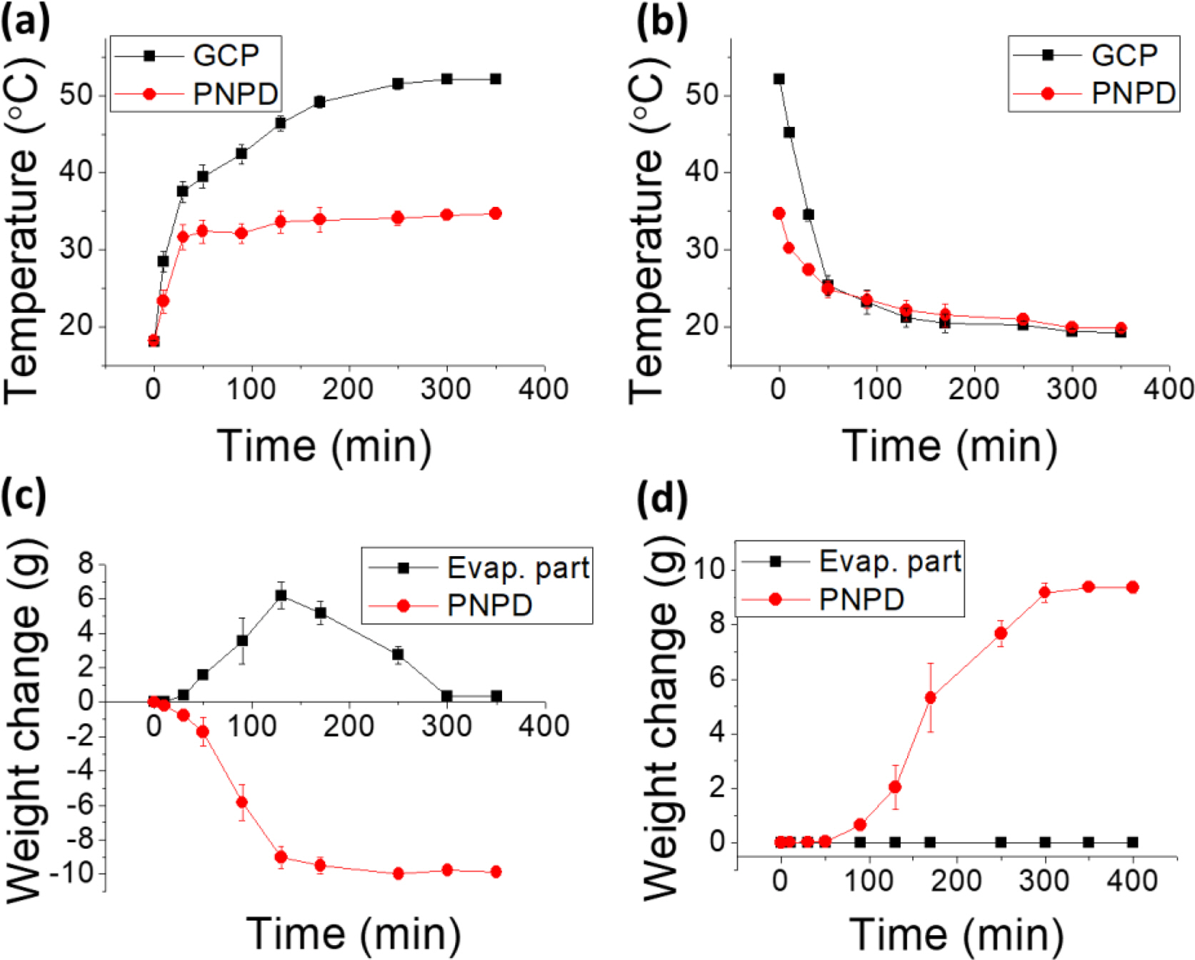 Figure 4 Temperature variance of GCP and PNPD with (a) solar simulator on (day condition); (b) solar simulator off (night condition); weight change of evaporation part and PNPD with (c) solar simulator on; (d) solar simulator off. |