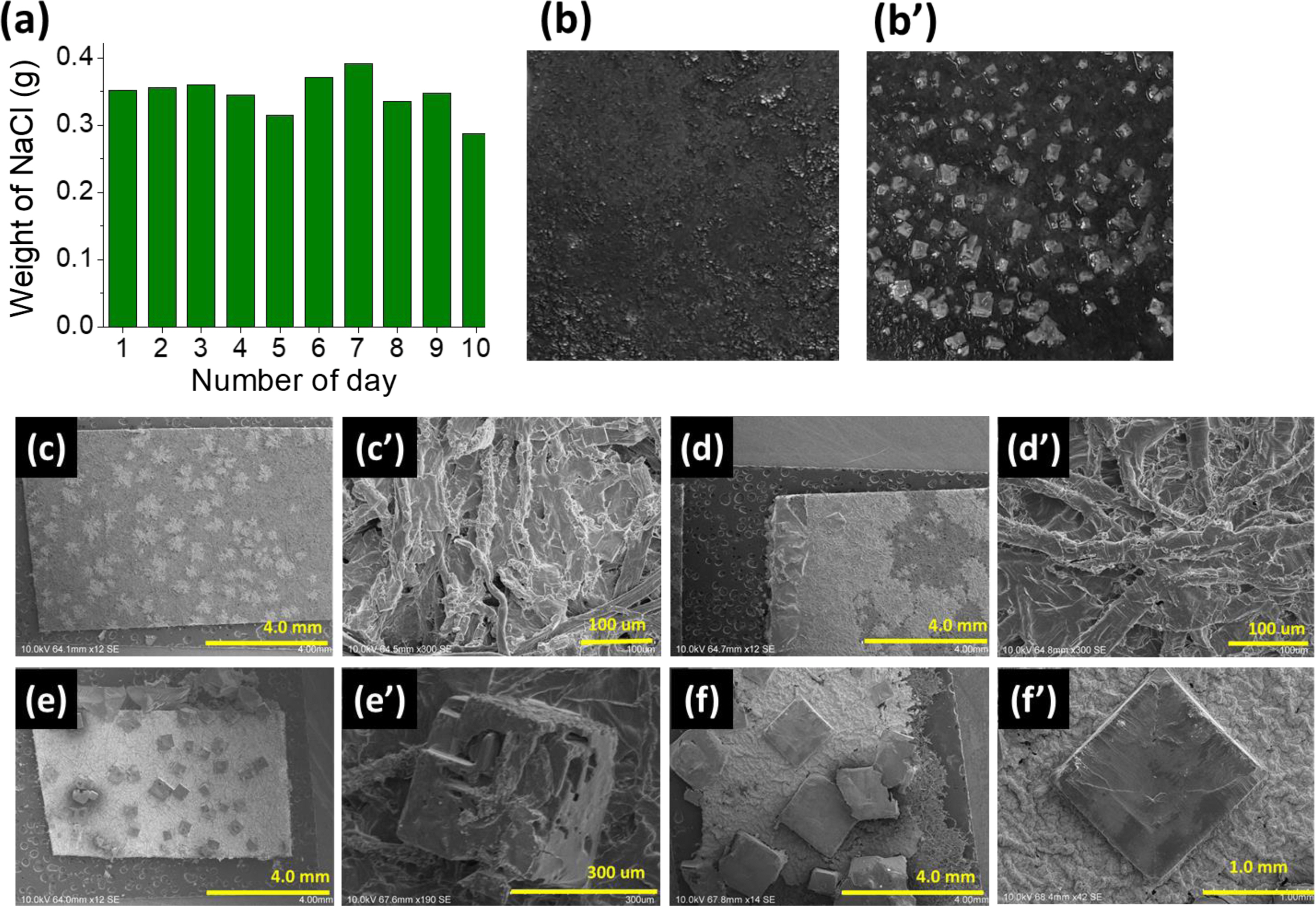 각각 5번째 낮 조건이 끝난 후 건조된 GCP의 윗면과 아랫면의 카메라 이미지다. 사진을 통해 소금결정은 GCP의 밑면에서 성장하는 것을 확인하였다. GCP에 생성되는 소금은 GCP의 셀룰로오스 섬유에서 결정이 성장하여 3번째 반복실험부터 면심입방구조를 갖는 염화나트륨 결정모습이 관찰된다.32 Figure 5(c)-5(f ')은 날짜 별 GCP의 SEM 이미지이다. SEM 이미지를 통해 해수 내의 다른 염들과 다르게 면심입방구조를 가지는 염화나트륨 결정이 증발기를 통해 얻어진다는 것을 확인하였다.