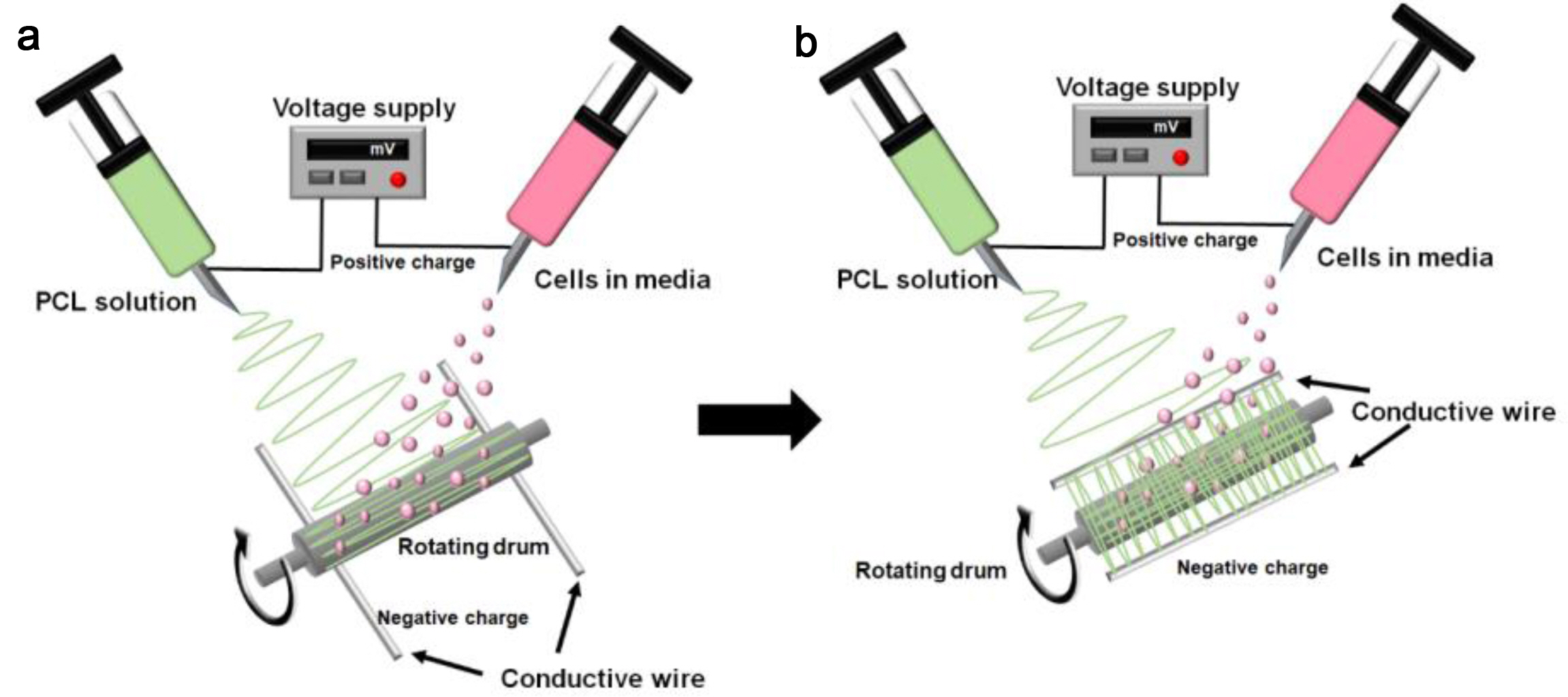 Schematic diagrams of electrohydrodynamic setup: (a) parallel; (b) orthogonal fibrous structures with the pockets for cells