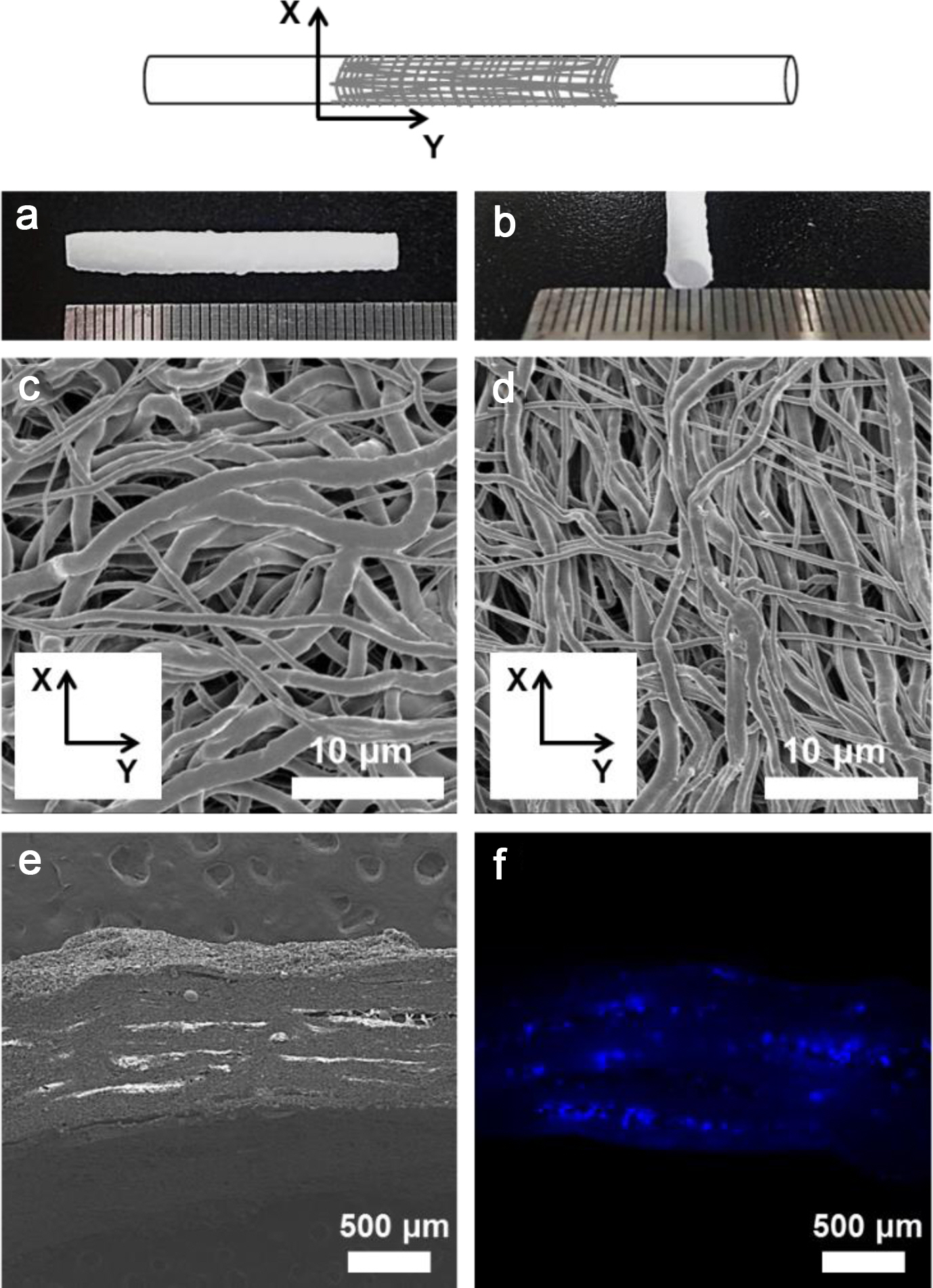 (a, b) Photographs of the fibrous tubular scaffold; (c, d) SEM images of the inner and outer surface of the fibrous tubular scaffold; (e) SEM image; (f) fluorescence microscope image of the cross-section of the fibrous tubular scaffold with DAPI-stained cells