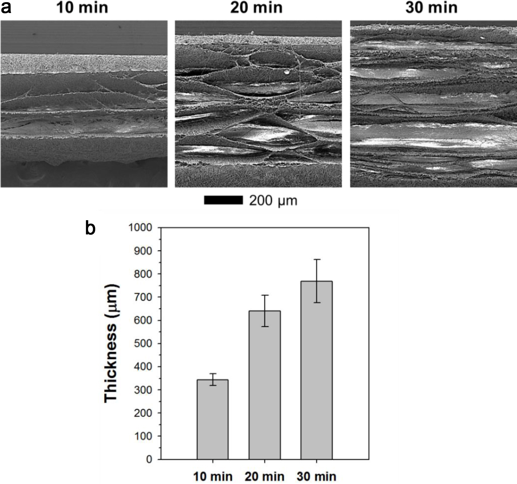 (a) SEM image of a cross section of tubular scaffold; (b) average thickness size of the scaffold prepared at different processing time (10, 20, and 30 min).