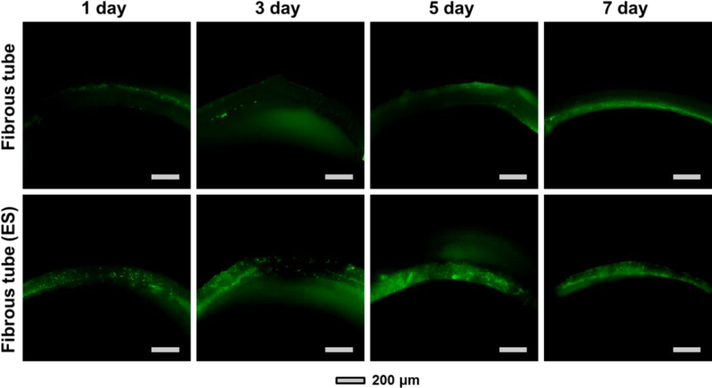 Figure 4 shows fluorescence microscopy images of cell proliferation on the conventional tubular scaffold and the cell sprayed tubular scaffold with respect to time. In the typical tubular scaffold, the cells grew on the surface, but did not penetrate inside the scaffold. However, the cells of the cell sprayed tubular scaffold can be identified inside the scaffold. The cells also survived for up to 7 days, suggesting that the tubular scaffold had a structure that could supply oxygen and nutrients to the inner cells. Cell invasion and growth in the scaffold are the most important conditions for facilitating ideal tissue regeneration.22 However, there have been various limitations in relation to cell viability during long treatments in vitro and the reproducibility of porosity and pore size.23,24 The combination of our electrospinning and electrospraying methods allowed us to produce tubular scaffolds with aligned fibrous structures containing living cells, and allowed cells to penetrate and grow for a time likely long enough to facilitate efficient tissue regeneration.