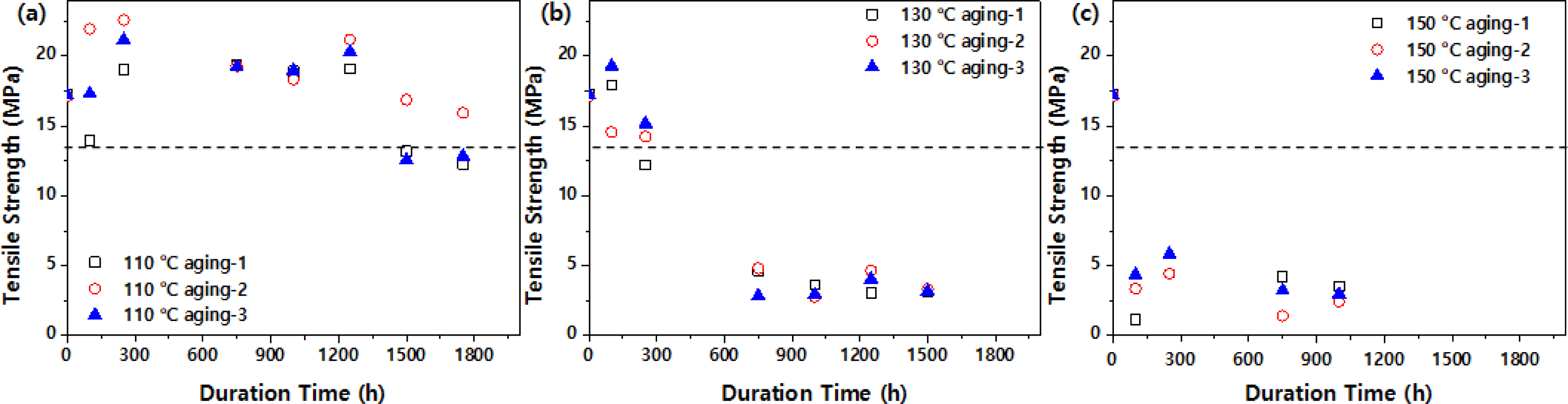 가속 열화 시험. 샘플의 열화에 의한 물성 변화를 알아보기 위해 각각 110 oC, 130 oC, 및 150 oC의 등온노화시험에서 시간에 따른 각 샘플의 인장강도 변화를 측정하였다. 측정 샘플은 각 온도당 3개의 시편을 측정하였다. 측정된 샘플 물성을 활용한 수명예측은 Minitab 프로그램을 사용하였다.