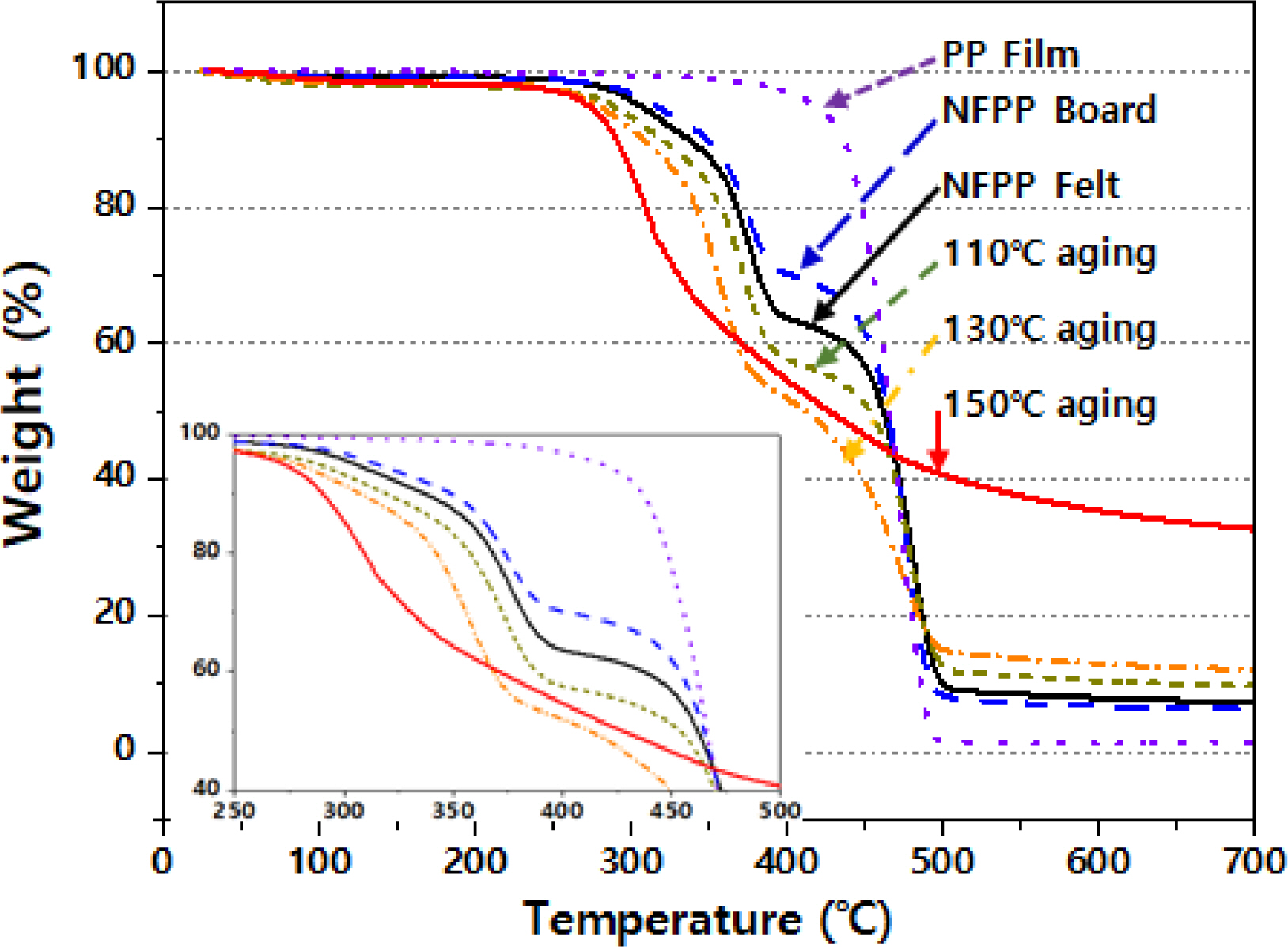 Figure 2는 PP 필름, 천연섬유/PP 복합펠트, 천연섬유/PP 복합재료의 열화 온도별 1000시간 노화 샘플에 대한 TGA 분석 그래프이다. Figure 2에서 보는 바와 같이, PP 필름은 443.7 oC에서 열분해가 시작되었다. 천연섬유/PP 복합펠트는 345 oC에서 완만한 열분해가 1차적으로 시작되어 440 oC 부근에서 2차 열분해가 진행되었다. 2차 열분해는 복합펠트 내의 PP 바인더 섬유로 판단된다. 천연섬유/PP 복합재료는 천연섬유/PP 복합펠트와 동일하게 344 oC에서 완만한 열분해가 1차적으로 시작되어 440 oC 부근에서 2차 열분해(PP 바인더 섬유와 PP 필름의 열분해)가 진행되었다. 다만, 천연섬유/PP 복합펠트는 1차 열분해시 무게 감소가 36% 수준이었으나, 천연섬유/PP 복합재료는 1차 열분해시 무게 감소가 30% 수준을 보였다. 이는 복합펠트에 PP 필름을 열압축하여 제작된 천연섬유/PP 복합재료 내에 PP의 함량이 더 높기 때문으로 판단된다.