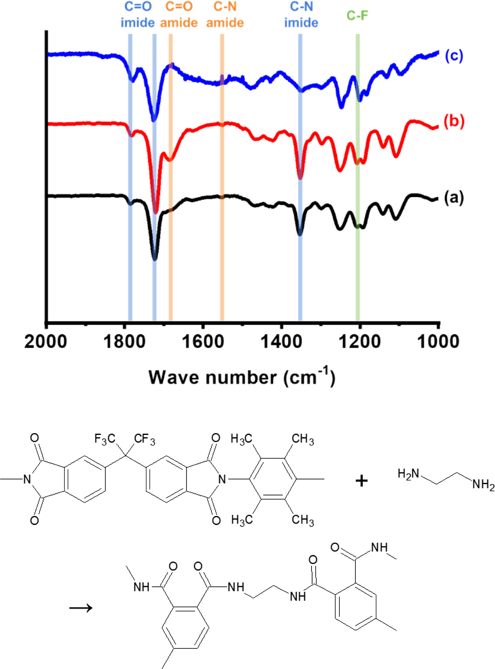 Fourier transform infrared spectra of (a) PI/PVDF; (b) crosslinked; (c) crosslinked and stabilized PI/PVDF.