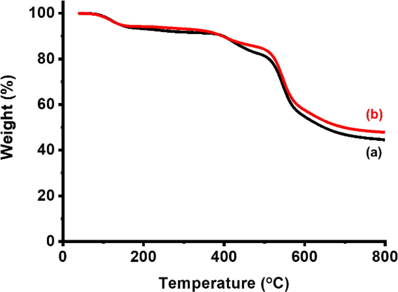 Thermogravimetric analysis of (a) PI/PVDF; (b) crosslinked PI/PVDF.