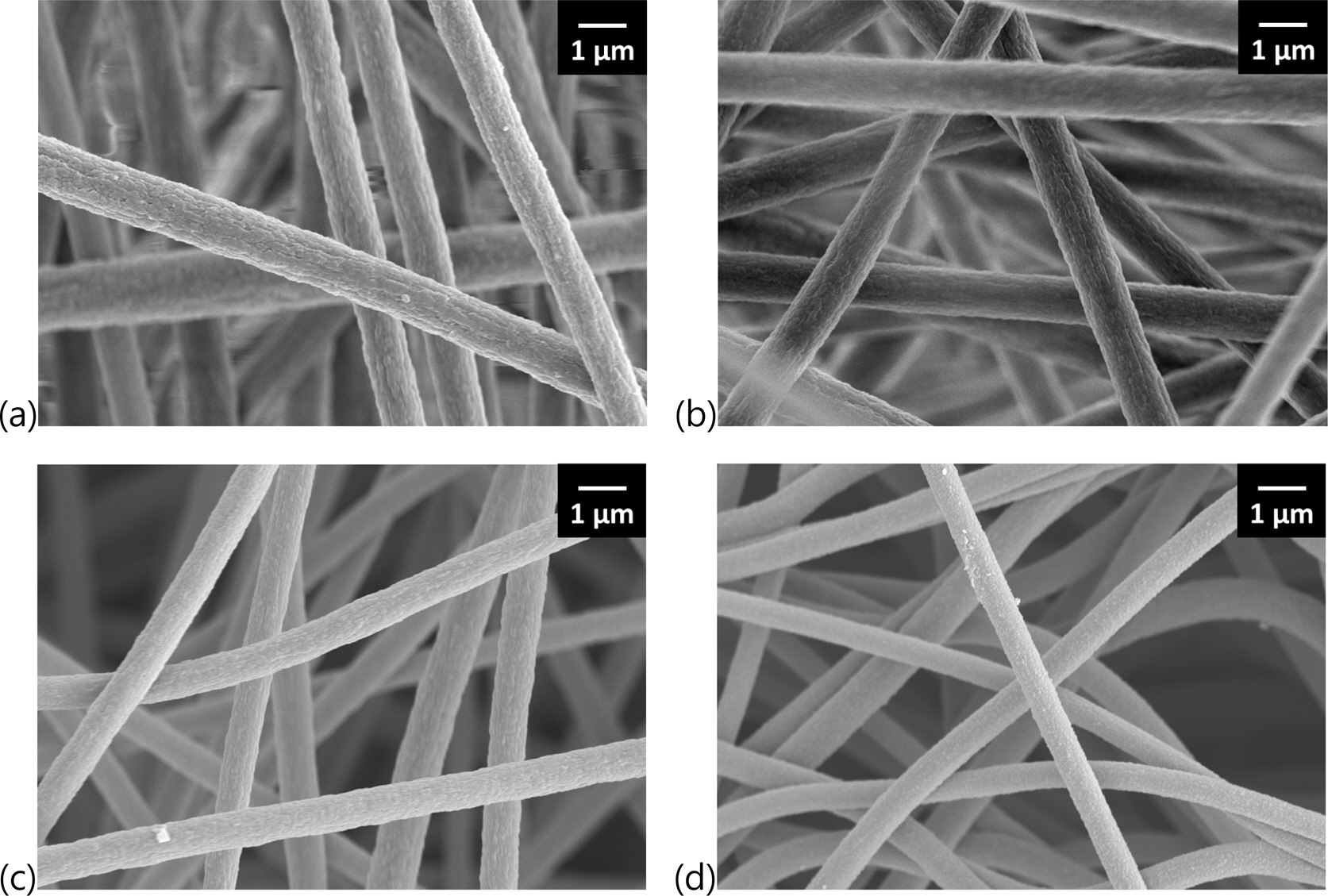 Surface morphology of (a) as-spun PI/PVDF; (b) as-spun crosslinked PI/PVDF; (c) carbonized PI/PVDF; (d) carbonized crosslinked-PI/PVDF nanofibers.