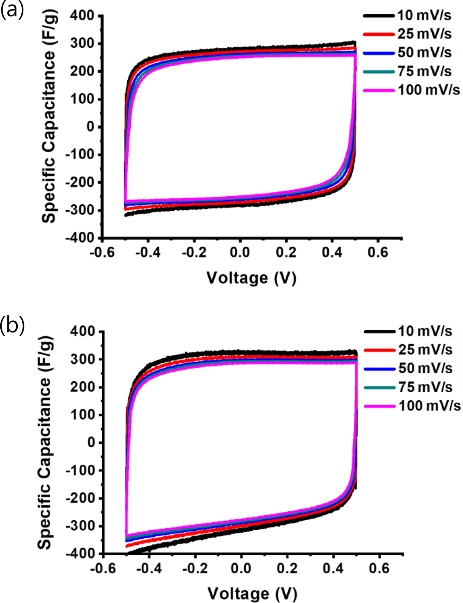 Cyclic performance at 100 mV/s of (a) CNFs derived from PI/PVDF; (b) CNFs derived from crosslinked PI/PVDF.