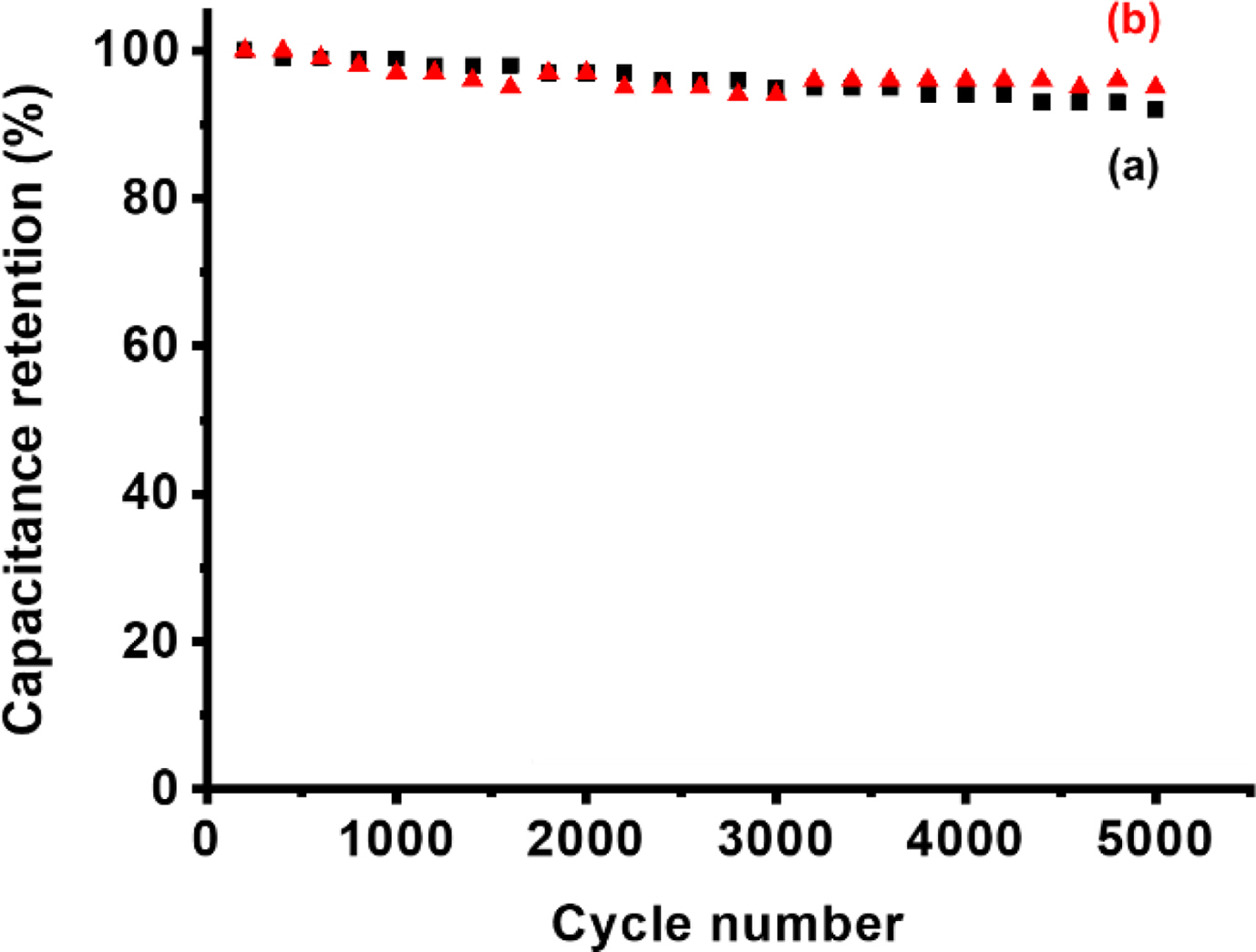 사이클 안정성 확인을 위하여 비정전용량 유지율을 측정하여 Figure 6에 나타내었다. 두 전극 모두 5000회 사이클에서 92% 이상의 유지율을 보였고, 가교를 시켜 탄화한 전극이 95%로 더 높은 유지율을 나타내었다. 제작한 CNF 전극이 슈퍼커패시터 중 EDLC의 가장 큰 장점 중 하나인 높은 사이클 안정성을 가짐을 확인할 수 있었다.