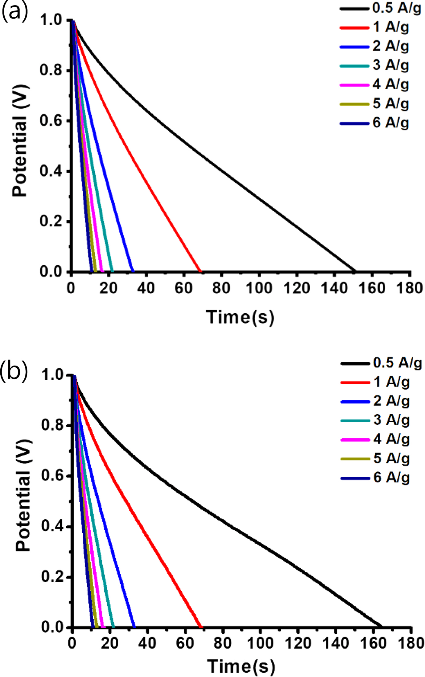 Galvanostatic discharge curves of (a) CNFs derived from PI/PVDF; (b) CNFs derived from crosslinked PI/PVDF with different current densities