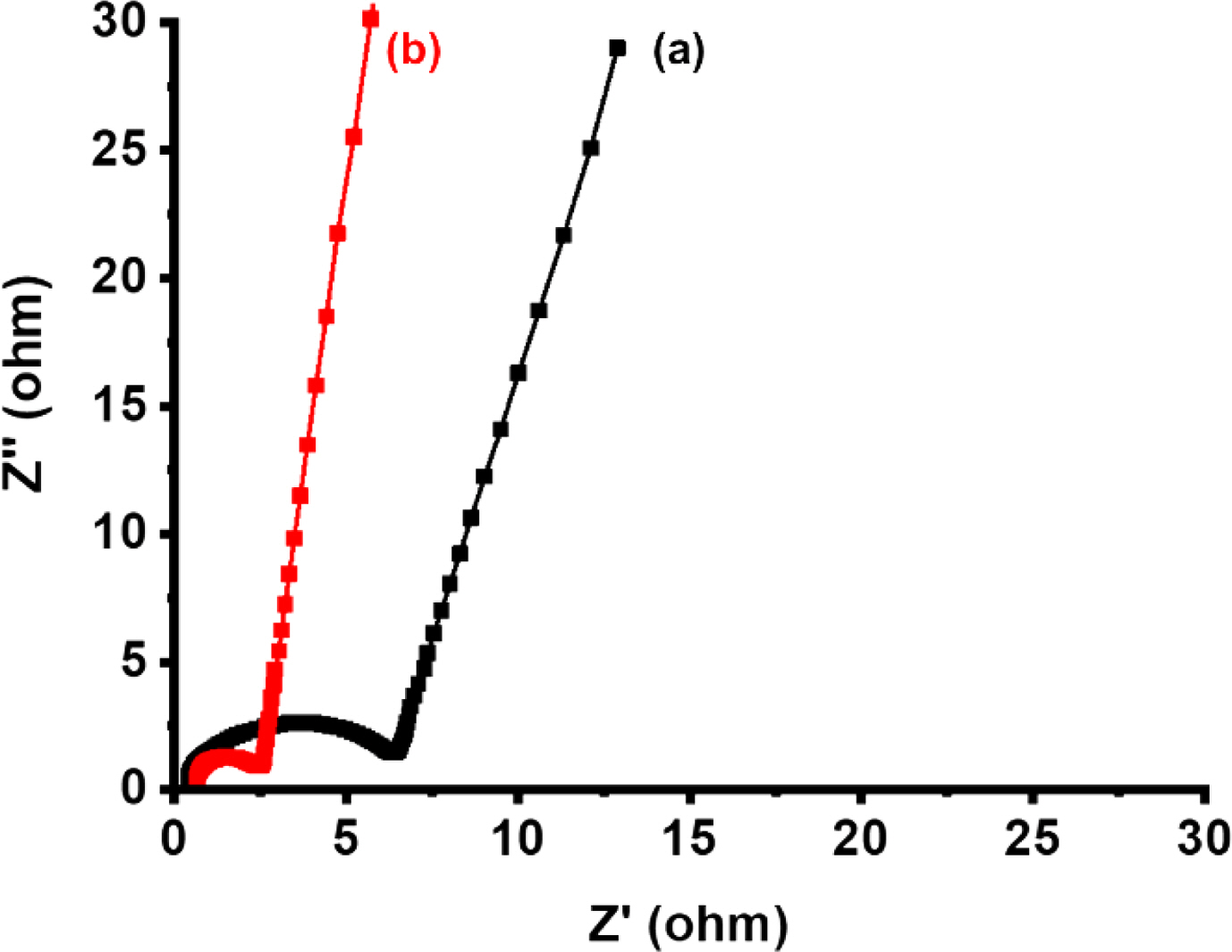 Electrochemical impedance spectra of (a) CNFs derived from PI/PVDF; (b) CNFs derived from crosslinked PI/PVDF.