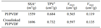 다공성 CNF 전극의 표면 특성.합성한 CNF의 전극으로서 중요한 특성인 비표면적과 다공성을 측정하였고, 그 결과를 Table 1에 나타내었다. 가교한 PI/PVDF를 열처리하여 합성한 CNF가 비표면적이 1697 m2/g으로 가교 처리를 하지 않고 합성한 CNF 대비 높은 값을 보였다. 총 기공 부피(total pore volume, TPV) 또한 0.732 cm3/로 가교 처리를 통해 높은 기공도를 얻을 수 있음을 확인하였다. 또한 메조 크기의 기공이 0.135 cm3/g로 총 기공의 18%가 2 nm 이상의 기공을 가짐을 확인할 수 있었다.