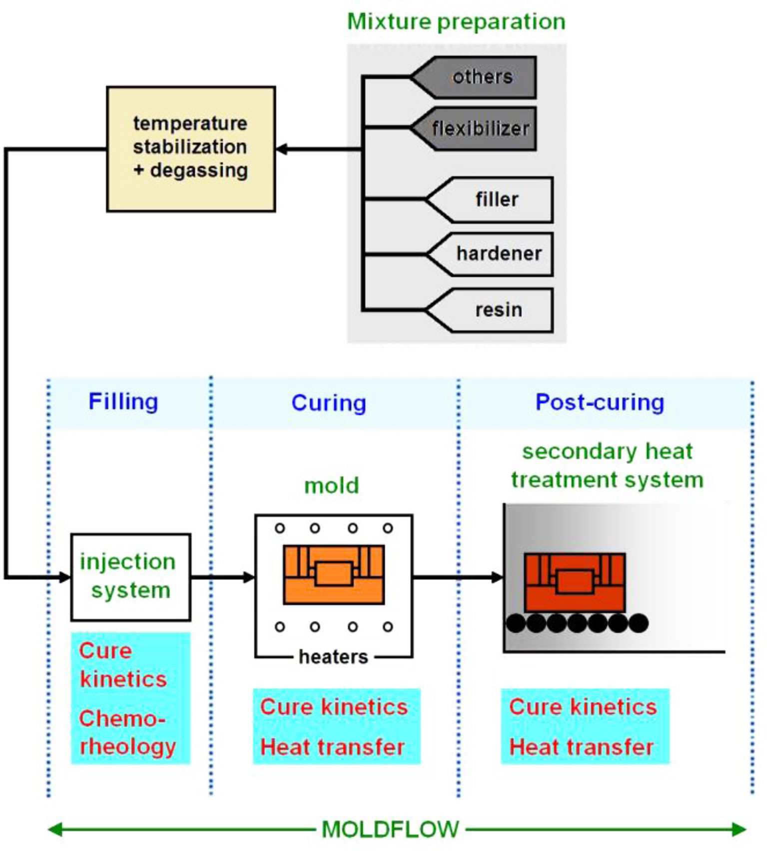 열경화성 수지는 망상구조를 형성하여 무한대의 분자량을 갖게 되는 경화과정에서 경로의존성(path dependency)과 유리화(vitrification) 등으로 완전 경화 상태에 도달하기가 쉽지 않다. 또한 충전과정 에서 높은 점도로 인해 공극(void)이 충분히 배출되지 못할 수도 있을 뿐 아니라 경화시 발열에 의해 급격하게 온도가 올라갈 경우 최종성형품에 잔류응력이 남게 될 수도 있다.5 이러한 가공상의 문제점들은 최종 성형품의 기계적, 전기적, 화학적 물성을 현저하게 감소시키게 되는 원인이 되곤 한다. 따라서, 경화 경로에 대한 정확한 해석과 이를 기초로 한 최적 조건(optimum condition)의 선정이 필수적이다. 이러한 최적 조건은 시행오차(trial and error)를 통해 선정할 수도 있으나 시간과 비용이 막대하게 소요된다. 이를 해결하는 가장 효과적인 방법은 경화반응 속도론(cure reaction kinetics) 및 화학유변학(chemorheology)을 기반 으로 한 공정 모델을 이용하여 컴퓨터 시뮬레이션을 수행하는 것이다. 비용이 드는 시제품 생산에 앞서서 여러가지 개념의 생산품을 설계, 최적화, 가시화하여 실제공정을 모사함으로써 시행착오를 줄이고 불량 발생으로 인한 위험요소(risk)를 제거하여 시간과 비용을 현저하게 절감할 수 있다.