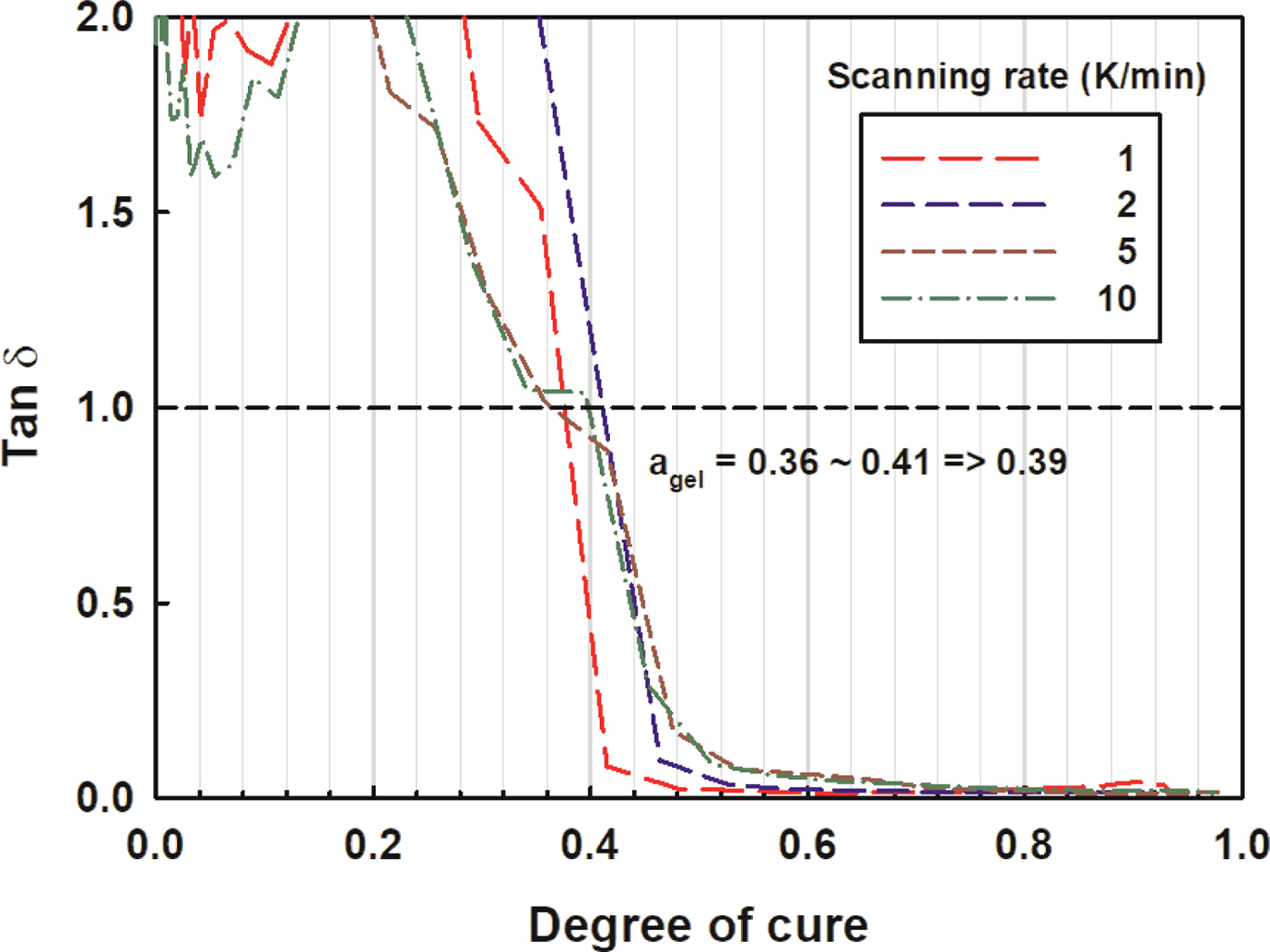 특정온도가 되면 경화가 어느정도 진행되어 점도 값으로도 확연하게 차이가 나기 시작하는데 이 부분이 겔화점에 해당한다. 탄성률 G'와 G''를 도시하여 교점을 구하거나 같은 의미인 tan d = 1 인 점으로 겔화점을 얻을 수 있다. 앞의 경화반응 속도론 부분에서 얻은 경화도와 레오미터에서 얻은 tan δ 값을 결합하여 Figure 8에 경화도에 따른 tan δ 값을 도시하였다. 승온속도에 따른 겔화점, 즉, tan α=1이 되는 점을 살펴보면 경화도가 0.36-0.41 부근이었고 대략 평균하면 0.39에 해당되었는데 이를 겔화점에서의 경화도로 정하였다.