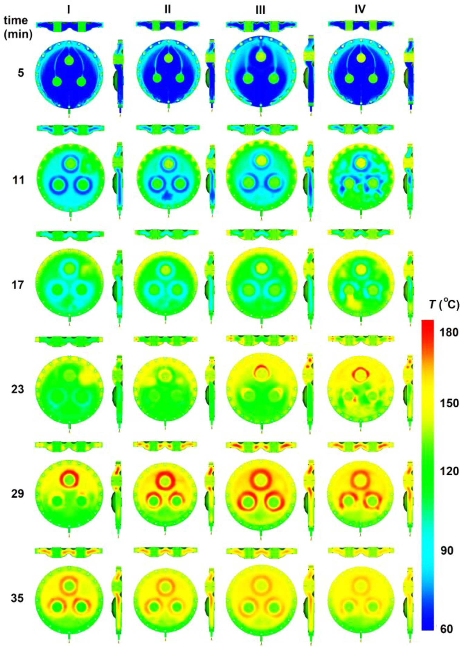 충전이 끝나면 패킹 과정으로 전환되는데 Figure 11에 각 설정온도에서 시간의 경과에 따른 패킹 과정에서의 단면의 온도 분포를 도시하였다. 설정 I을 보면 5분이 지났을 때 금형온도의 영향을 가장 빨리 받은 가장자리 부분이 하늘색(90 oC 부근)이고 나머지 부분은 푸른색(60 oC 부근)인 것을 볼 수 있다. 11분에서는 가장 자리가 녹색(120 oC 부근)으로 변했고 그 안쪽은 하늘색, 그리고 도체 부분은 푸른 색을 조금 나타낸 것을 볼 수 있다. 이는 금형으로부터 수지 내부로 열이 전달되는 것을 나타낸다. 그러나 17분이 되었을 때 오른쪽 위부분이 주변 보다 높은 온도인 노란색(140 oC 부근)을 보였는데 이는 열전달 속도가 느린 에폭시 수지의 내부에서 발생한 경화열이 충분히 주변부로 흐르지 못해 온도가 상승한 것으로 판단된다. 23분이 되었을 때는 노란부분이 더 선명해졌고 29분이 되었을 때는 위의 절반정도가 노란색이 되었고 위쪽 도체 주변에는 반응이 더 진행되어 붉은색(170 oC 부근)이 나타났다. 35분 정도가 되었을 때는 안쪽 부분 이 주변부 보다 온도가 높았으며 모든 도체 주변에 옅은 붉은 띠를 볼 수 있다. 위쪽 도체주위의 붉은 띠도 옅어졌는데 이는 반응이 거의 완료되어 열전달의 영향이 지배적이기 때문으로 사료된다. 이러한 경향은 설정 온도가 증가할수록 더 심해졌는데 특이할 만한 점은 29분을 보면 설정 II와 III이 IV보다 더 내부온도가 높다는 것이다. 이는 IV의 경우 29분 전 단계에서 더 높은 설정 온도로 인해 경화반응이 많이 진행되어 29분에서는 경화반응 속도 자체가 줄었기 때문이라 사료된다. 최종제품의 품질을 고려했을 때 온도 만으로 판단해 보면 성형품의 모든 부분이 균일한 온도를 가지는 것이 제일 좋을 것이다. 이상적으로는 모든 부분이 같은 열이력을 갖고 편차가 적은 것이 좋기 때문이다. 따라서 온도 패턴으로만 보면 낮은 온도 조건인 설정 I이 비교적 좋을 것으로 판단된다.