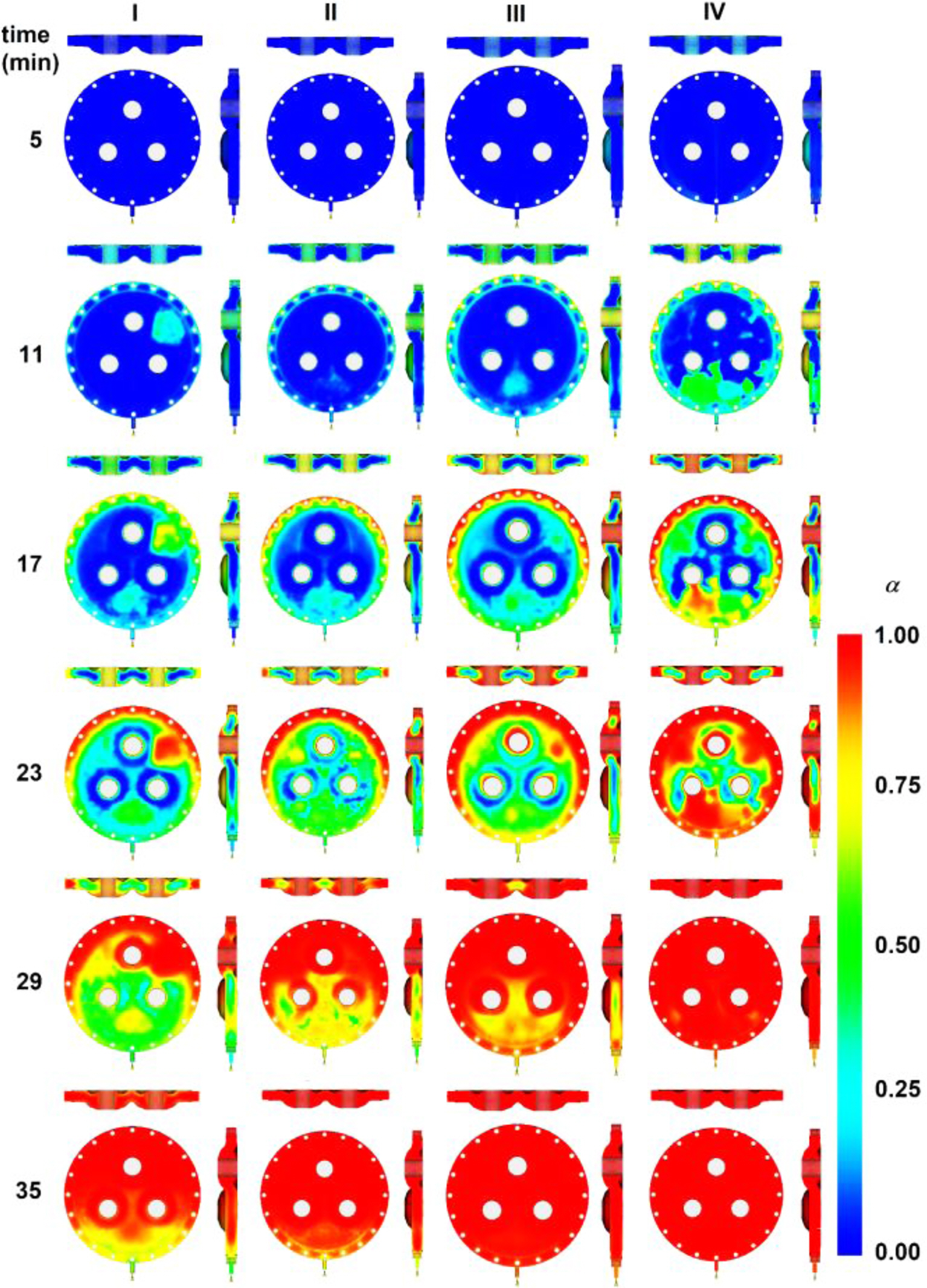 23분에는 위쪽 가장자리가 경화도 0.9에 가깝게 되었고 이를 시작으로 29분에는 경화도가 아래쪽으로 퍼지는 것을 볼 수 있으며 35분에는 맨 아래 쪽을 제외하고는 거의 경화가 완료되었다. 패킹 과정이 끝난 이후에는 금형과 내부 잠열로 인해 반응이 좀 더 진행되어 최종완료 될 것이다. 설정 온도가 높을수록 경화가 더 빨리 진행되었는데 29분에서 설정 III과 IV를 보면 금형 입구(gate)부분의 색이 노란색이거나 주황색에 가까웠다. 이는 경화도가 0.75를 넘는 것으로 이렇게 되면 아직 전체적으로 경화가 완료되지 않은 상태에서 입구가 막혀서 패킹 압력이 제대로 전달되지 못하는 문제가 발생하게 된다. 반면에 I과 II의 경우에는 아직 녹색을 띠고 있다. 그러나 이 또한 겔화점 부근이므로 안심하기는 어렵다. 따라서 좋기로는 설정 I이나 II를 기준으로 하고 입구에 가까운 히터 8(좌/우)의 설정을 조금 낮추는 것이 좋을 것으로 판단된다. 패킹과정은 과정이 진행되는 동안 지속적으로 압력을 가하여 경화에 따른 수축 등을 보완해야 하는 바 입구에서 가장 먼 부분부터 경화가 진행되어 입구 쪽으로 점차 퍼져가는 패턴을 만드는 조건을 찾는 것이 바람직하다고 판단된다.