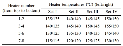 Figure 11 Temperature distribution during packing stage at different heater temperature sets. |
