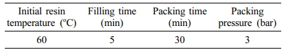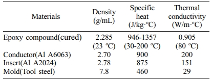 수치모사.스페이서 모델에 대한 수치모사는 미국 Autodesk사의 몰드플로우(mold flow) 소프트웨어를 사용하였다. GIS 스페이서의 3차원 도면은 동우전기㈜로부터 제공받았으며 Figure 3과 같다. 각각의 금형 한쪽에 히터를 8개씩 설치하여 금형 온도의 변화를 주면서 성형품 내부의 온도 및 경화도를 관찰하였다. 온도 조건을 정리하여 Table 1에 수록하였고 본 연구에서 사용된 금형, 금구, 도체, 성형 물질의 특성 들을 Table 2에, 그리고 그 밖의 가공조건은 Table 3에 정리하였다.