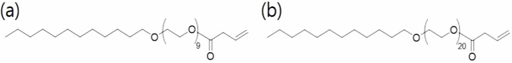 Figure 1 Structure of nonionic reactive emulsifiers: (a) 2-dodecyloxy-polyethyleneglycol (9) 3-butenoate; (b) 2-dodecyloxy-polyethyleneglycol (20) 3-butenoate. |