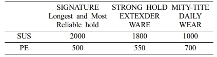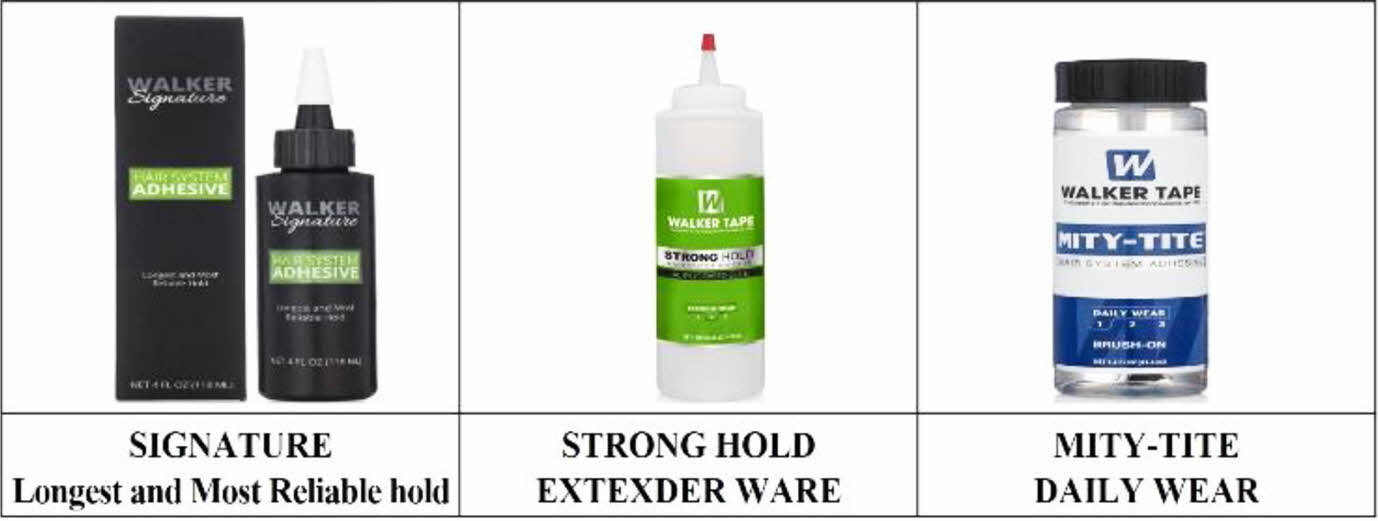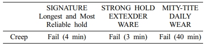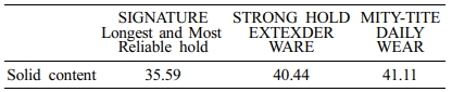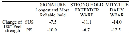 제조된 수성형 점착제와의 박리강도를 비교하기 위하여 용제형 가모용 점착제의 박리강도를 측정하여 Table 6에 나타냈다. SIGNATURE Longest and Most Reliable hold의 경우 피착제가 SUS, PE에서 2000, 500 g/25 mm, STRONG HOLD EXTEXDER WARE의 경우 피착제가 SUS, PE에서 1800, 300 g/25 mm, MITY-TITE DAILY WEAR의 경우 피착제가 SUS, PE에서 1000, 400 g/25 mm를 갖는 것으로 제조된 수성 점착제보다 낮은 박리강도를 가지는 것으로 측정되었다.