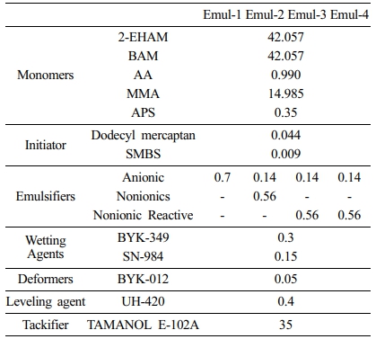 수성형 점착제는 물을 분산매로 사용하므로 친환경적이며, 다른 고분자 에멀젼과의 우수한 상용성, 높은 고형분 함량화, 폭넓은 점도 조정 및 점착 후 잔사가 거의 없다는 우수한 특성을 갖고 있지만,6,7 용제형 점착제와 비교했을 때 건조시간이 길고 점착과 관련된 물성이 떨어지는 단점을 가지고 있다.8,9 따라서, 가모용 점착제에서 용제형 점착제를 대체하기 위해서는 용제형 점착제 수준의 물성을 가진 수성형 점착제 개발이 요구된다.10-12 수성형 점착제는 계면활성제나 wetting agent, 소포제, 점도 조절제 등의 저분자량 성분들이 피막의 형성 방법과 형성과정에 영향을 주어 물성(내습·내수성 등)이 용제형에 비해 뒤떨어지므로 반응성 유화제를 사용하여 베이스 에멀젼을 제조하고, 적합한 첨가제를 활용한 최적의 수계 점착제 배합 제조 기술을 개발하게 되면 향상된 물성을 가진 점착제를 얻을 수 있다.13-18
