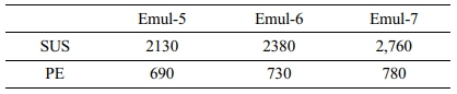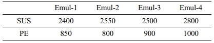 점착력: 유화제 조합을 달리하고 동일한 함량의 점착부여제를 사용하여 제조된 점착제의 점착력 측정결과는 Table 4에 나타냈다. Steel use stainless(SUS)를 피착제로 사용하였을 때, Emul-1의 경우 2400 g/25 mm, Emul-2의 경우 2550 g/25 mm, Emul-3의 경우 2500 g/25 mm, 그리고 Emul-4의 경우 2800 g/25 mm로 측정되었다. 피착제가 PE인 경우에는 Emul-1, Emul-2, Emul-3, 그리고 Emul-4에서 850 g/25 mm, 800 g/25 mm, 900 g/25 mm, 그리고 1000 g/25 mm로 SUS 피착제에 비해 박리강도가 낮게 측정되었다. 이는 점착제를 비롯한 접착성 물질에서 일반적으로 볼 수 있는 경우로 표면에너지가 높은 SUS에 대한 점착력이 우수하나, 표면에너지가 낮은 PE에 대한 점착력은 그다지 높지 않은 것을 알 수 있다. 피착제 종류에 상관없이 음이온 유화제와 EO 몰수가 큰 비이온 반응성 유화제 조합으로 제조된 Emul-4 점착제의 박리강도가 우수한 것을 알 수 있다.